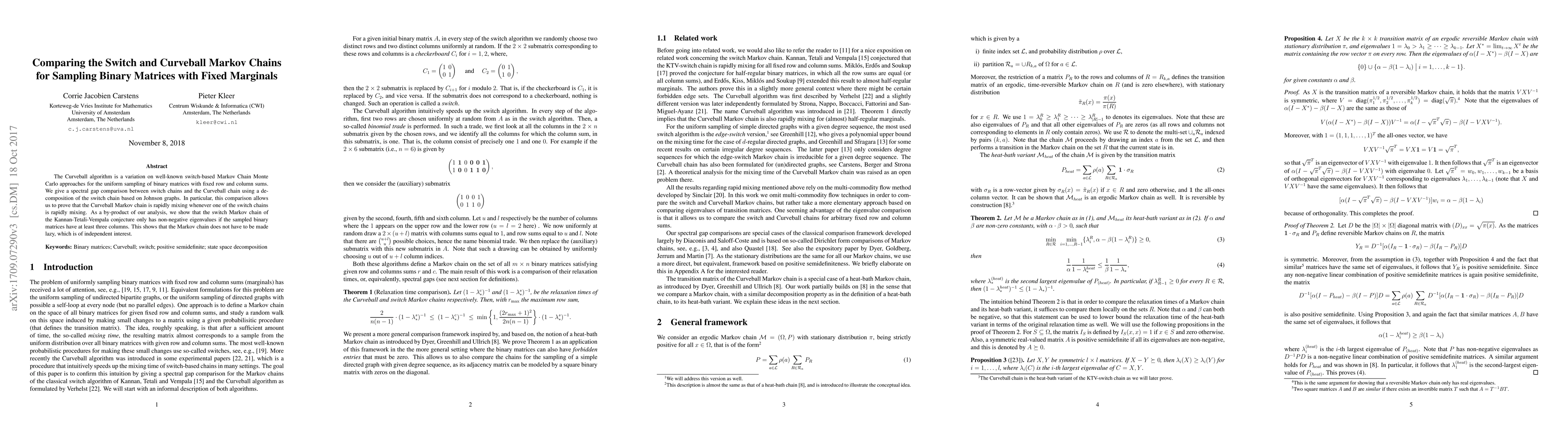 This paper compares the Curveball Markov chain with switch-based Markov chains for sampling binary matrices with fixed marginals, showing that the Curveball chain exhibits rapid mixing under certain conditions, and provides insights into the eigenvalue properties of switch-based chains.