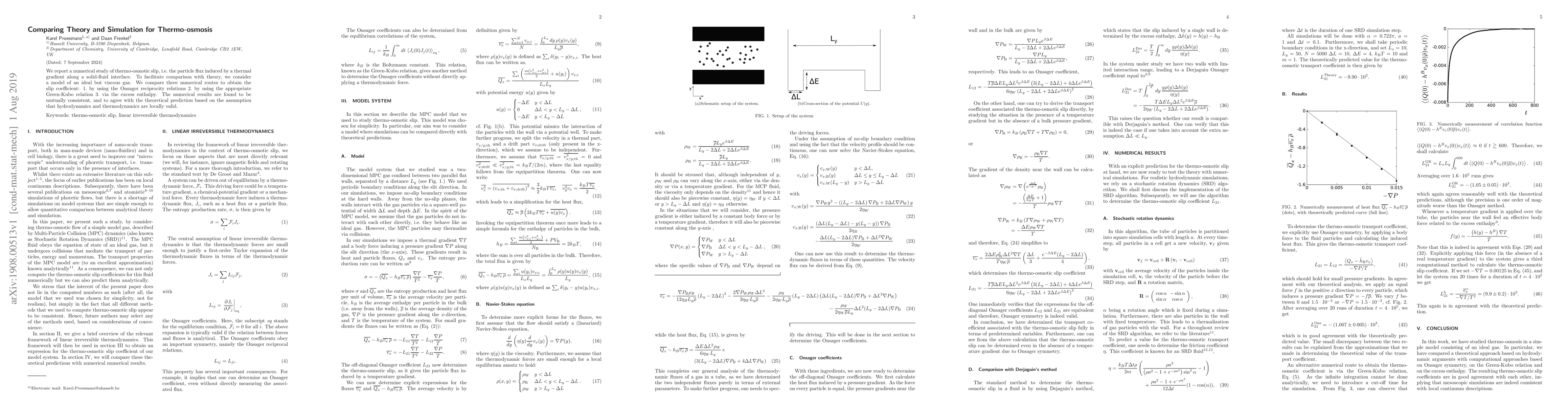 We report a numerical study of thermo-osmotic slip, i.e. the particle flux induced by a thermal gradient along a solid-fluid interface. To facilitate comparison with theory, we consider a model of an ideal but viscous gas. We compare three numerical routes to obtain the slip coefficient: 1. by using the Onsager reciprocity relations 2. by using the appropriate Green-Kubo relation 3. via the excess enthalpy. The numerical results are found to be mutually consistent, and to agree with the theoretical prediction based on the assumption that hydrodynamics and thermodynamics are locally valid.
