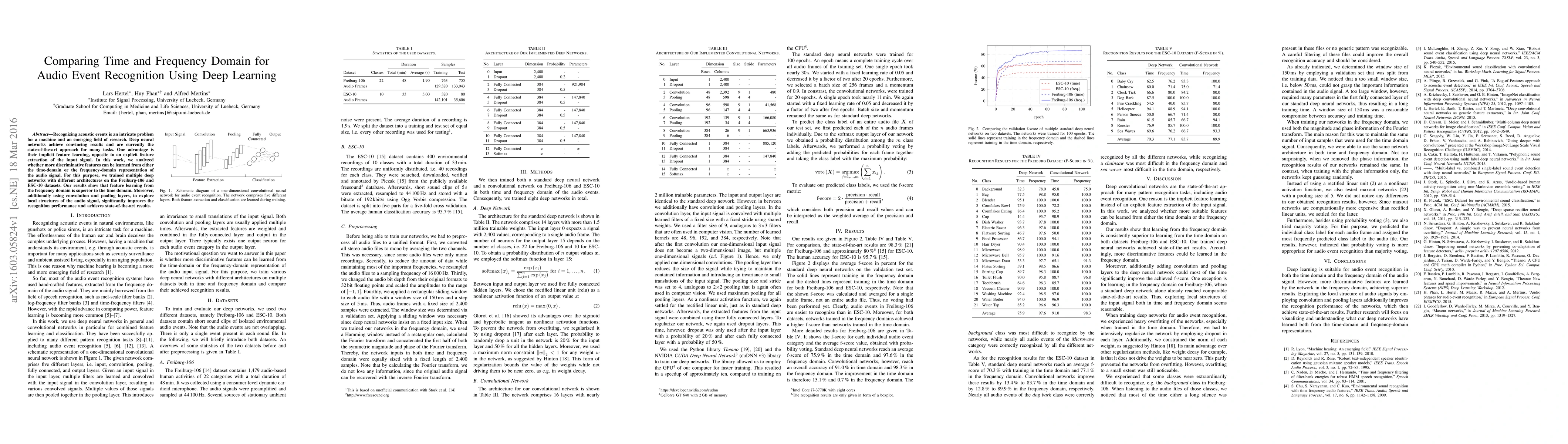 A study compares using time and frequency domain representations for audio event recognition with deep learning, finding that frequency domain features lead to better results. Using convolution and pooling layers also improves recognition performance and achieves state-of-the-art results.