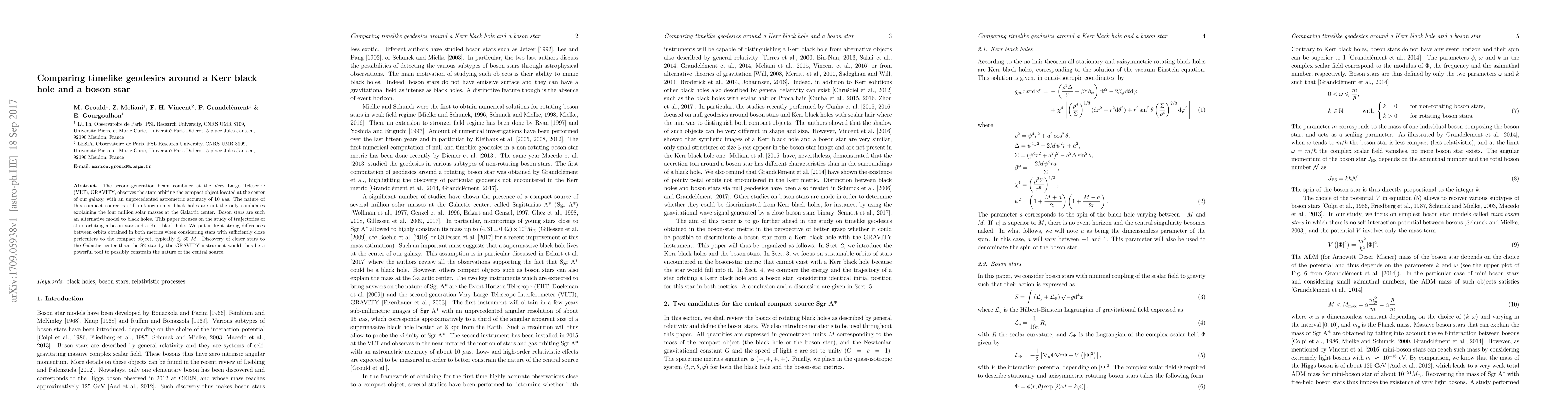 The second-generation beam combiner at the Very Large Telescope (VLT), GRAVITY, observes the stars orbiting the compact object located at the center of our galaxy, with an unprecedented astrometric accuracy of 10 $\mu$as. The nature of this compact source is still unknown since black holes are not the only candidates explaining the four million solar masses at the Galactic center. Boson stars are such an alternative model to black holes. This paper focuses on the study of trajectories of stars orbiting a boson star and a Kerr black hole. We put in light strong differences between orbits obtained in both metrics when considering stars with sufficiently close pericenters to the compact object, typically $\lesssim 30~M$. Discovery of closer stars to the Galactic center than the S2 star by the GRAVITY instrument would thus be a powerful tool to possibly constrain the nature of the central source.
