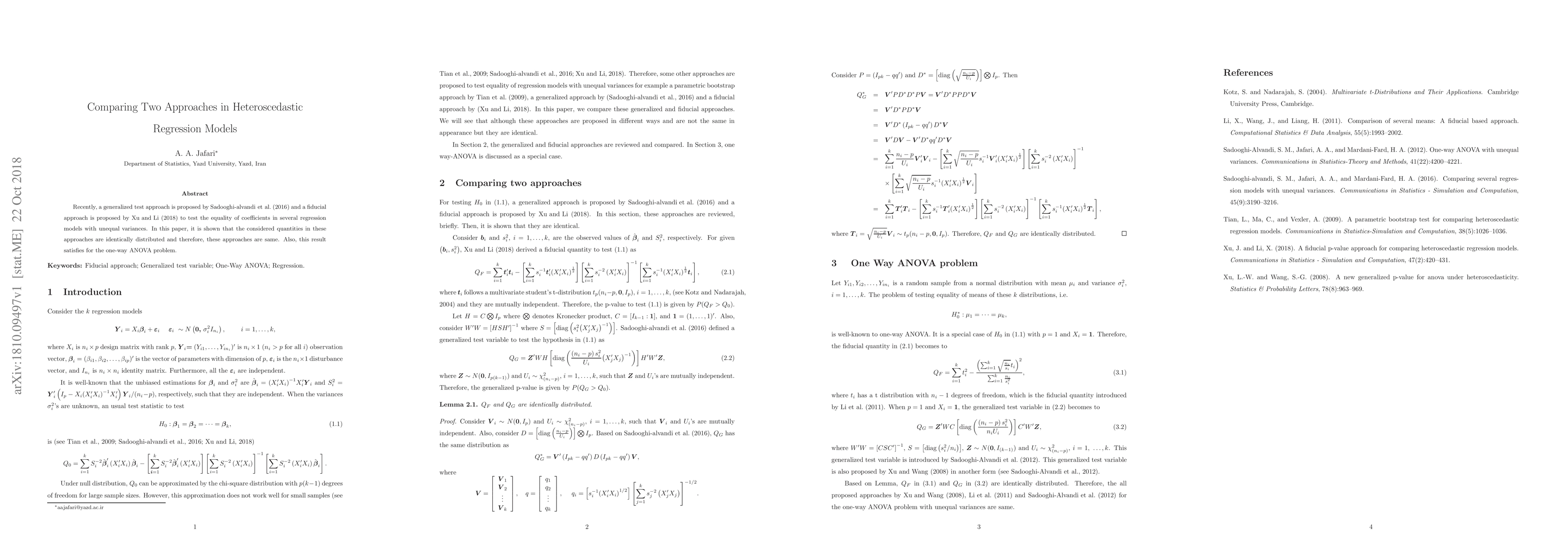 Recently, a generalized test approach is proposed by Sadooghi-alvandi et al. (2016) and a fiducial approach is proposed by Xu and Li (2018) to test the equality of coefficients in several regression models with unequal variances. In this paper, it is shown that the considered quantities in these approaches are identically distributed and therefore, these approaches are same. Also, this result satisfies for the one-way ANOVA problem.