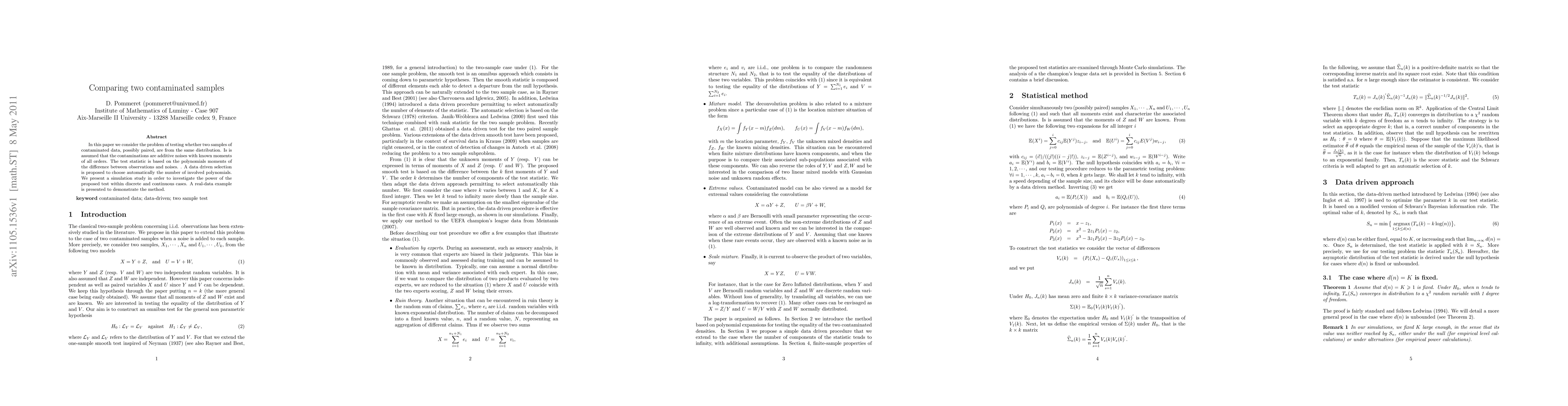We consider the problem of testing whether two samples of contaminated data, possibly paired, are from the same distribution. Is is assumed that the contaminations are additive noises with known moments of all orders. The test statistic is based on the polynomials moments of the difference between observations and noises. . A data driven selection is proposed to choose automatically the number of involved polynomials. We present a simulation study in order to investigate the power of the proposed test within discrete and continuous cases. A real-data example is presented to demonstrate the method.