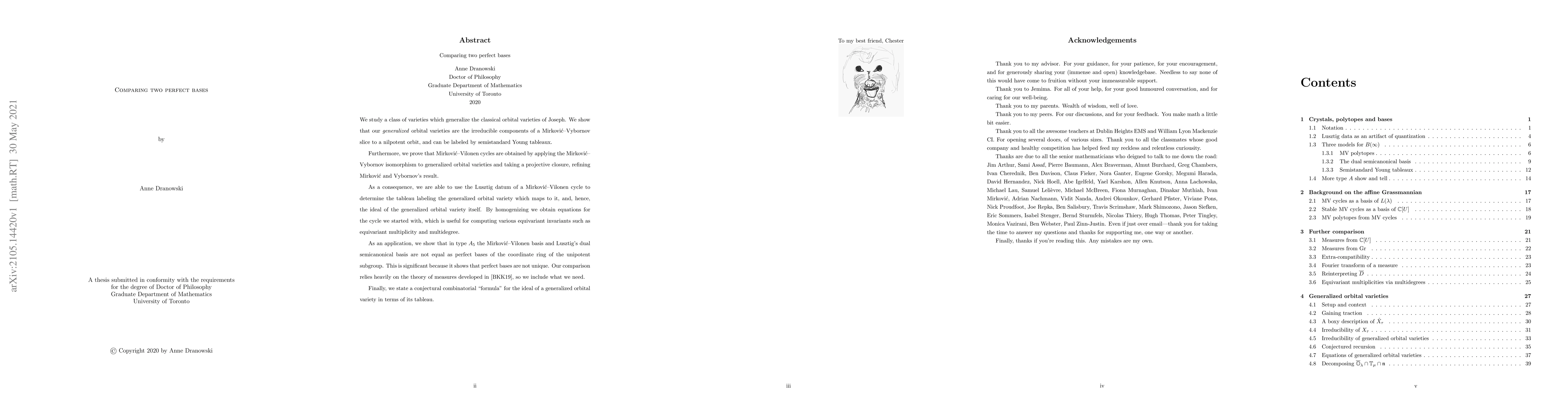 We study a class of varieties which generalize the classical orbital varieties of Joseph. We show that our generalized orbital varieties are the irreducible components of a Mirkovic-Vybornov slice to a nilpotent orbit, and can be labeled by semistandard Young tableaux. Furthermore, we prove that Mirkovic-Vilonen cycles are obtained by applying the Mirkovic-Vybornov isomorphism to generalized orbital varieties and taking a projective closure, refining Mirkovic and Vybornov's result. As a consequence, we are able to use the Lusztig datum of a Mirkovic--Vilonen cycle to determine the tableau labeling the generalized orbital variety which maps to it, and, hence, the ideal of the generalized orbital variety itself. By homogenizing we obtain equations for the cycle we started with, which is useful for computing various equivariant invariants such as equivariant multiplicity and multidegree. As an application, we show that in type $A_5$ the Mirkovic-Vilonen basis and Lusztig's dual semicanonical basis are not equal as perfect bases of the coordinate ring of the unipotent subgroup. This is significant because it shows that perfect bases are not unique. Our comparison relies heavily on the theory of measures developed in Baumann, Kamnitzer, and Knutson's MV Basis and DH Measures (2019), and we include what we need to be self-contained. Finally, we state a conjectural combinatorial "formula" for the ideal of a generalized orbital variety in terms of its tableau.