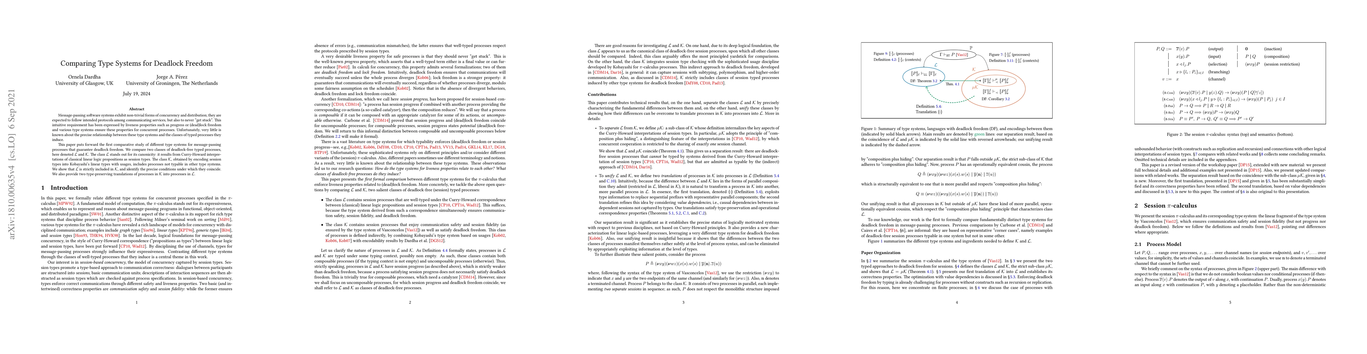 This paper conducts the first comparative analysis of type systems ensuring deadlock freedom in message-passing concurrent processes, specifically focusing on two classes L and K. It reveals that class L, derived from linear logic, is strictly included in class K, which uses Kobayashi's linear types, and identifies conditions for their equivalence, along with translations between them.