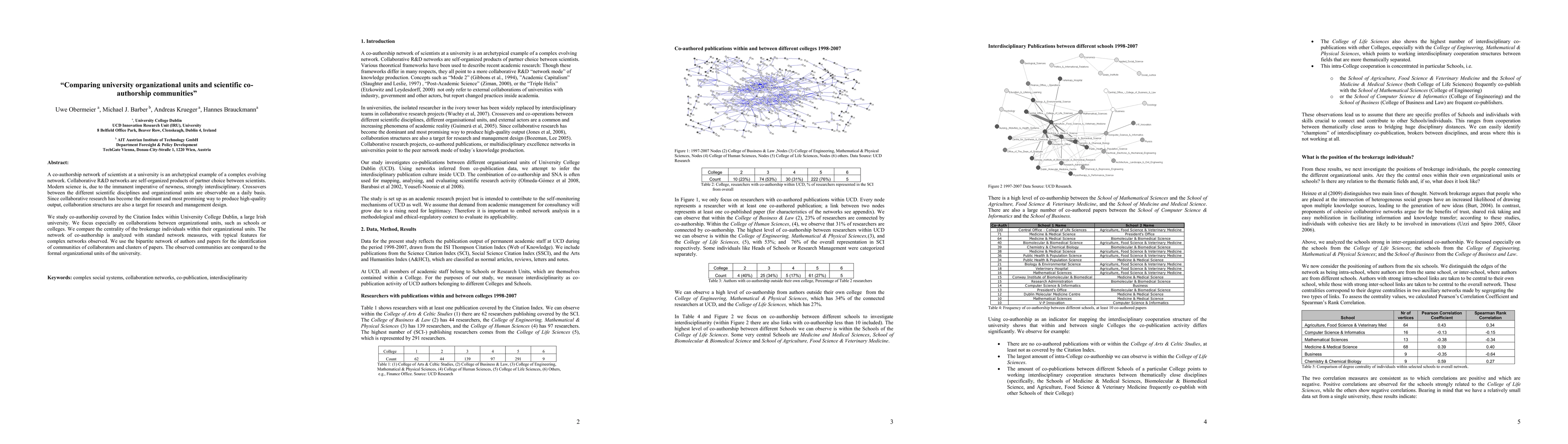 This paper examines the co-authorship network among scientists at University College Dublin, focusing on collaborations between different organizational units. It analyzes the centrality of brokerage individuals and compares identified communities of collaborators with the university's formal organizational structure using network measures and bipartite network analysis.