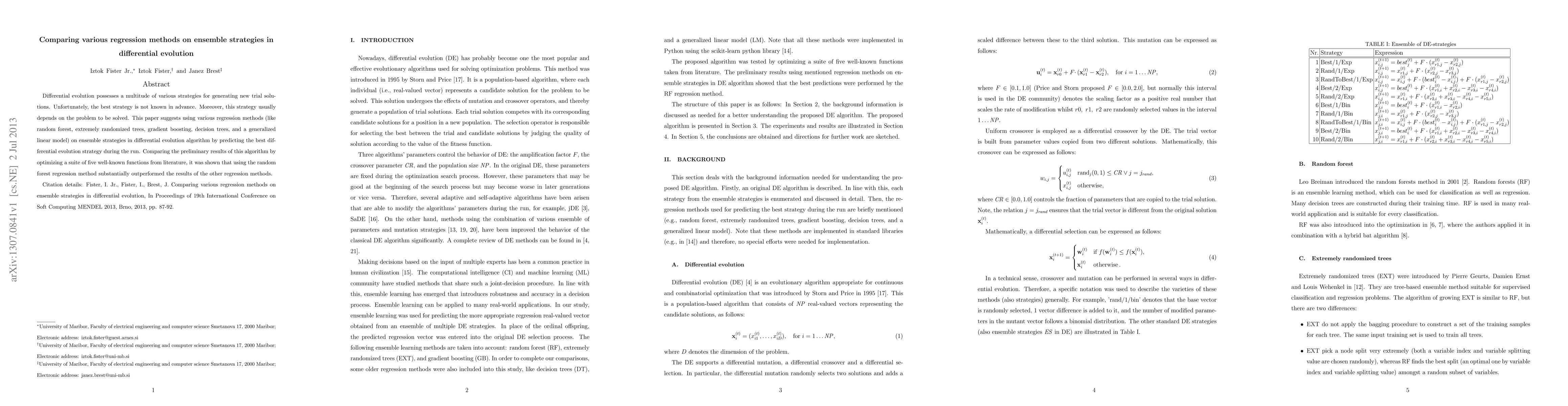 This paper explores the use of various regression methods to predict the best differential evolution strategy during execution, finding that random forest regression significantly outperforms other methods like gradient boosting and decision trees in optimizing a set of five benchmark functions.