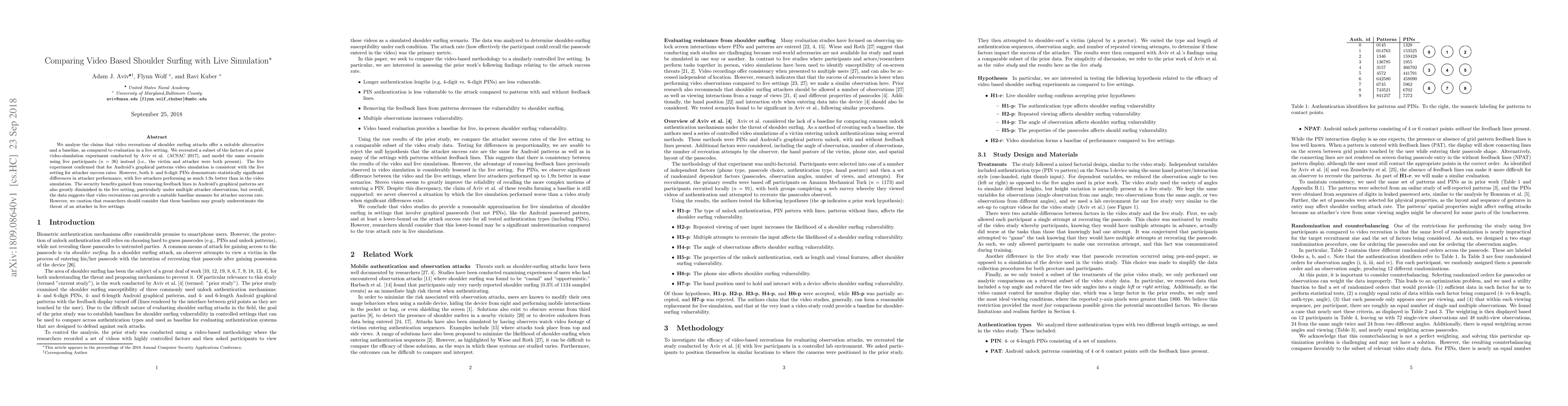 A live simulation study found that video recreations of shoulder surfing attacks offer a suitable baseline for attacker success rates, but may underestimate the threat in real-life settings.