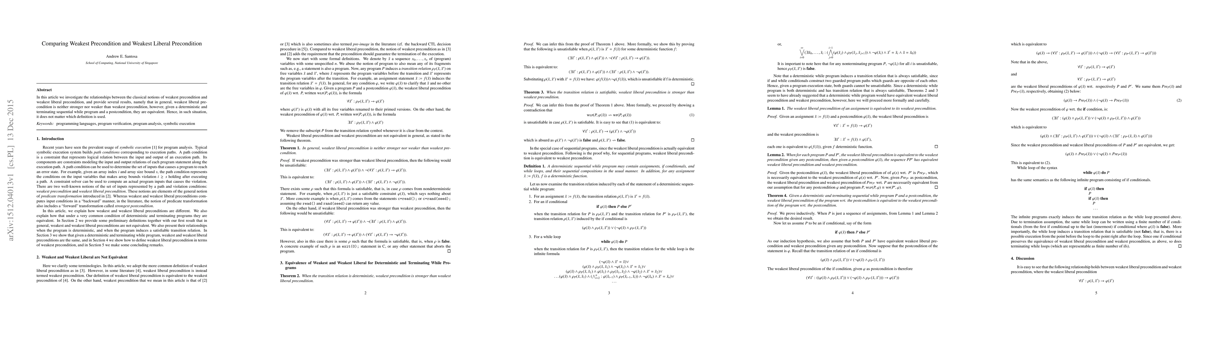 The paper provides formal definitions and proofs comparing weakest precondition and weakest liberal precondition, establishing conditions under which they are equivalent.