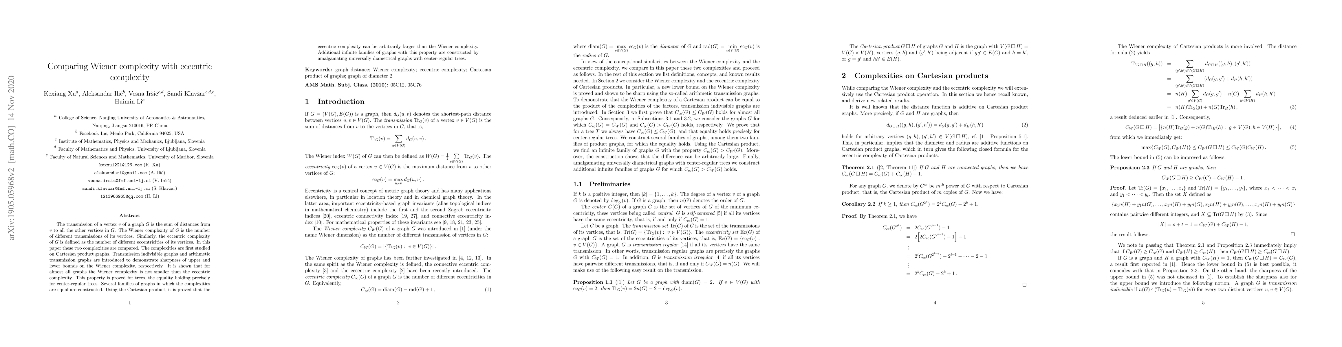 The transmission of a vertex $v$ of a graph $G$ is the sum of distances from $v$ to all the other vertices in $G$. The Wiener complexity of $G$ is the number of different transmissions of its vertices. Similarly, the eccentric complexity of $G$ is defined as the number of different eccentricities of its vertices. In this paper these two complexities are compared. The complexities are first studied on Cartesian product graphs. Transmission indivisible graphs and arithmetic transmission graphs are introduced to demonstrate sharpness of upper and lower bounds on the Wiener complexity, respectively. It is shown that for almost all graphs the Wiener complexity is not smaller than the eccentric complexity. This property is proved for trees, the equality holding precisely for center-regular trees. Several families of graphs in which the complexities are equal are constructed. Using the Cartesian product, it is proved that the eccentric complexity can be arbitrarily larger than the Wiener complexity. Additional infinite families of graphs with this property are constructed by amalgamating universally diametrical graphs with center-regular trees.