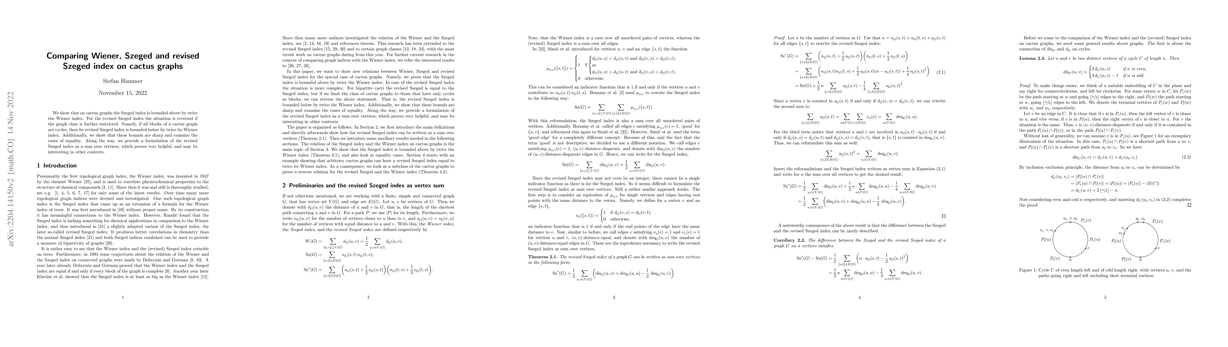 This study compares the Wiener, Szeged, and revised Szeged indices on cactus graphs, demonstrating that the Szeged index is upper-bounded by twice the Wiener index, while the revised Szeged index is lower-bounded by twice the Wiener index under certain conditions. The authors show these bounds are tight and discuss cases of equality.