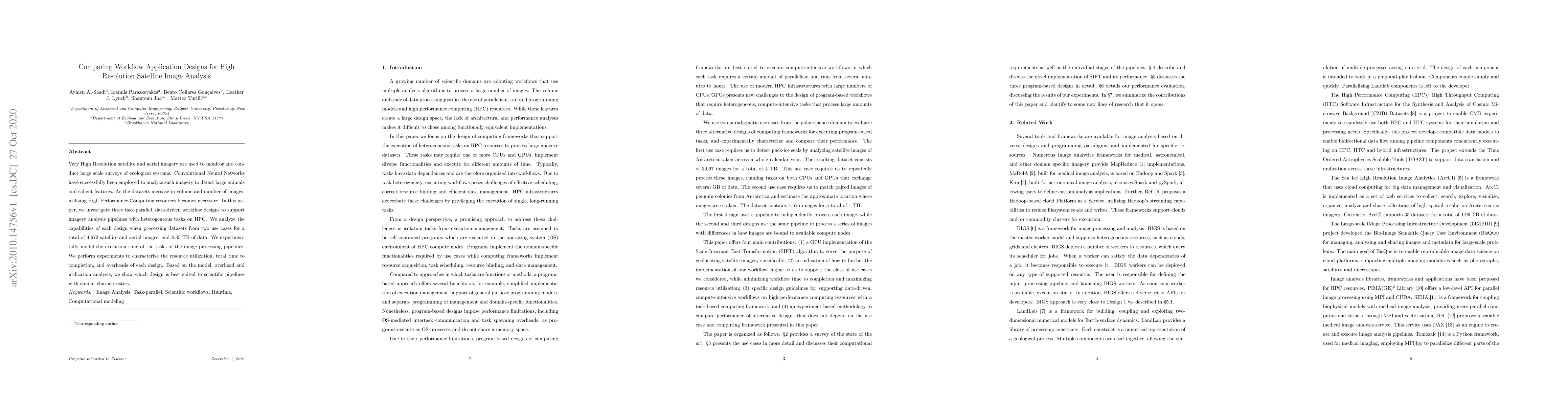 Very High Resolution satellite and aerial imagery are used to monitor and conduct large scale surveys of ecological systems. Convolutional Neural Networks have successfully been employed to analyze such imagery to detect large animals and salient features. As the datasets increase in volume and number of images, utilizing High Performance Computing resources becomes necessary. In this paper, we investigate three task-parallel, data-driven workflow designs to support imagery analysis pipelines with heterogeneous tasks on HPC. We analyze the capabilities of each design when processing datasets from two use cases for a total of 4,672 satellite and aerial images, and 8.35 TB of data. We experimentally model the execution time of the tasks of the image processing pipelines. We perform experiments to characterize the resource utilization, total time to completion, and overheads of each design. Based on the model, overhead and utilization analysis, we show which design is best suited to scientific pipelines with similar characteristics.