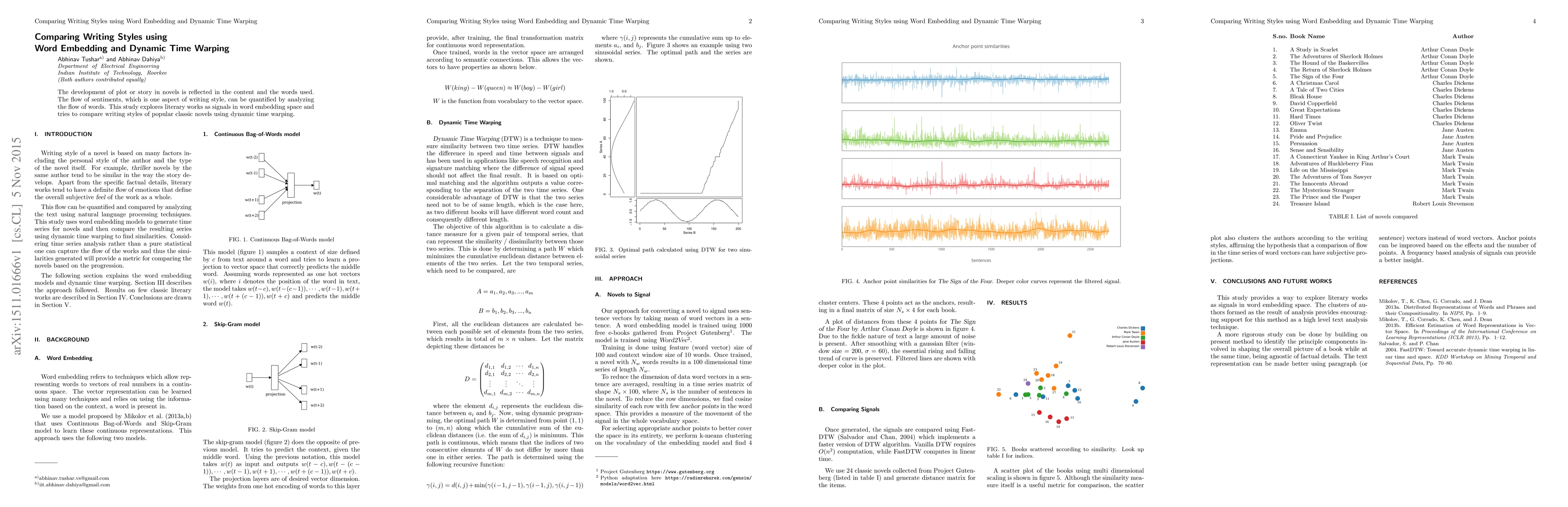 This study uses word embedding to represent literary works as signals and employs dynamic time warping to compare the writing styles of classic novels by analyzing the flow of sentiments through their word usage.