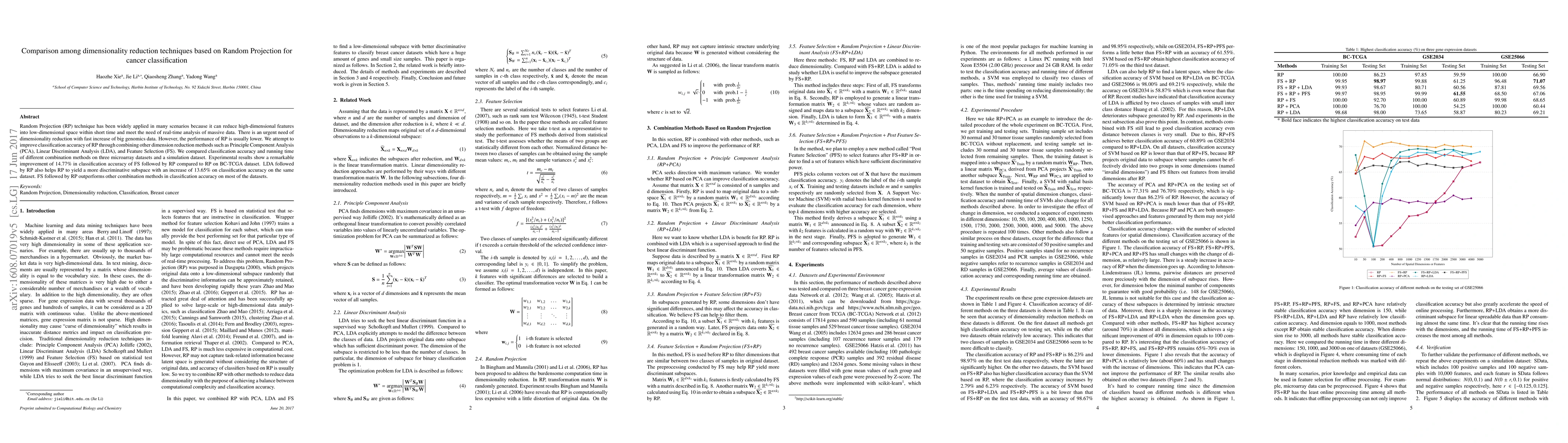 This study compares various dimensionality reduction techniques, including Random Projection (RP), PCA, LDA, and Feature Selection (FS) for cancer classification. The results show that combining FS with RP significantly improves classification accuracy by 14.77% on the BC-TCGA dataset, highlighting the effectiveness of hybrid methods in genomic data analysis.
