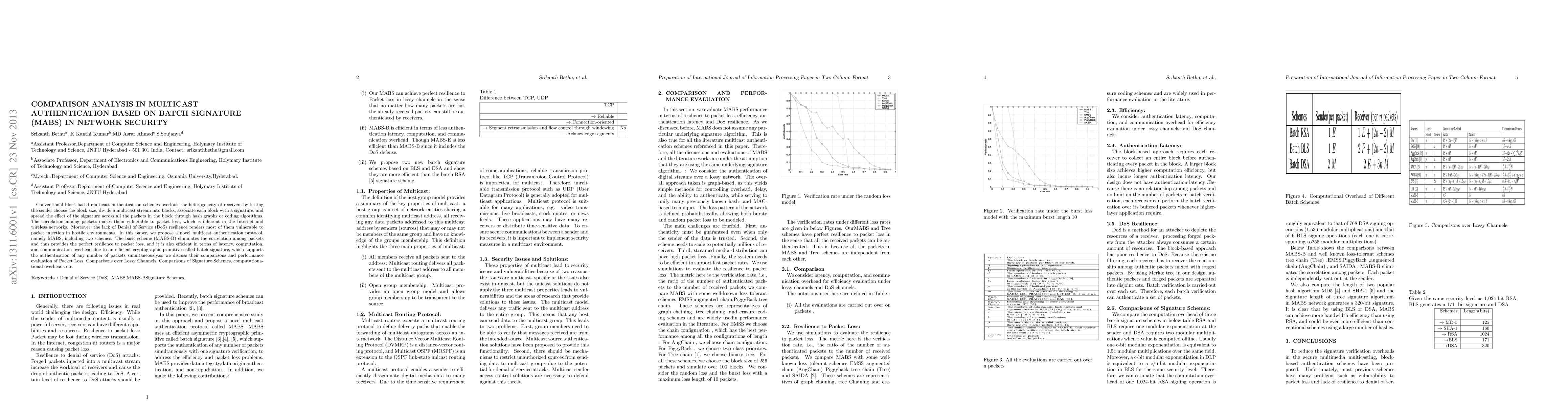 Conventional block-based multicast authentication schemes overlook the heterogeneity of receivers by letting the sender choose the block size, divide a multicast stream into blocks, associate each block with a signature, and spread the effect of the signature across all the packets in the block through hash graphs or coding algorithms. The correlation among packets makes them vulnerable to packet loss, which is inherent in the Internet and wireless networks. Moreover, the lack of Denial of Service (DoS) resilience renders most of them vulnerable to packet injection in hostile environments. In this paper, we propose a novel multicast authentication protocol, namely MABS, including two schemes. The basic scheme (MABS-B) eliminates the correlation among packets and thus provides the perfect resilience to packet loss, and it is also efficient in terms of latency, computation, and communication overhead due to an efficient cryptographic primitive called batch signature, which supports the authentication of any number of packets simultaneously.so we discuss their comparisons and performance evaluation of Packet Loss, Comparisons over Lossy Channels, Comparisons of Signature Schemes, computationational overheads etc.