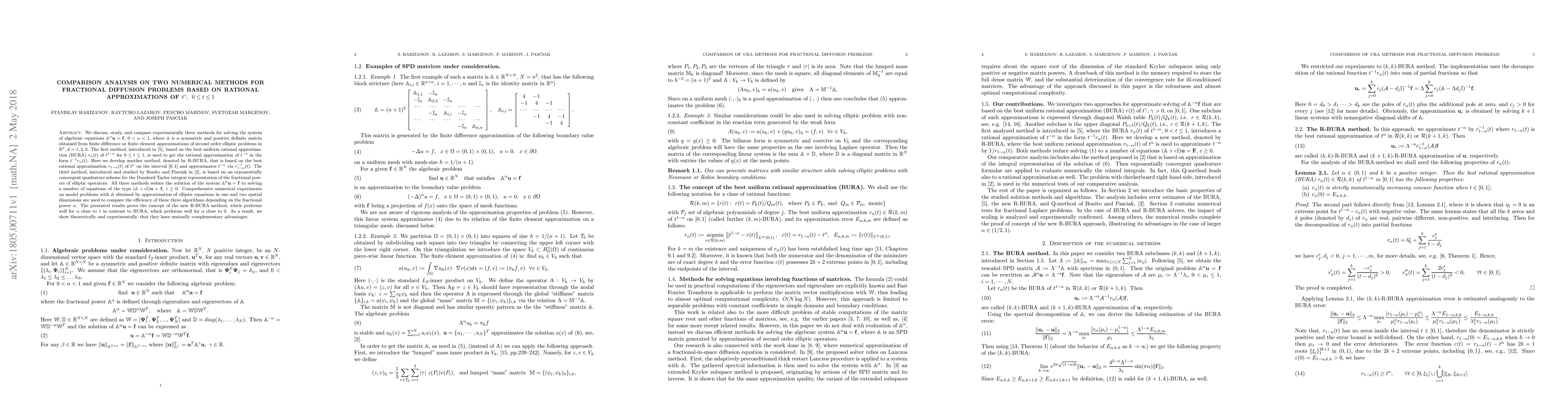 We discuss, study, and compare experimentally three methods for solving the system of algebraic equations $\mathbb{A}^\alpha \bf{u}=\bf{f}$, $0< \alpha <1$, where $\mathbb{A}$ is a symmetric and positive definite matrix obtained from finite difference or finite element approximations of second order elliptic problems in $\mathbb{R}^d$, $d=1,2,3$. The first method, introduced by Harizanov et.al, based on the best uniform rational approximation (BURA) $r_\alpha(t)$ of $t^{1-\alpha}$ for $0 \le t \le 1$, is used to get the rational approximation of $t^{-\alpha}$ in the form $t^{-1}r_\alpha(t)$. Here we develop another method, denoted by R-BURA, that is based on the best rational approximation $r_{1-\alpha}(t)$ of $t^\alpha$ on the interval $[0,1]$ and approximates $t^{-\alpha}$ via $r^{-1}_{1-\alpha}(t)$. The third method, introduced and studied by Bonito and Pasciak, is based on an exponentially convergent quadrature scheme for the Dundord-Taylor integral representation of the fractional powers of elliptic operators. All three methods reduce the solution of the system $\mathbb{A}^\alpha \bf{u}=\bf{f}$ to solving a number of equations of the type $(\mathbb{A} +c\mathbb{I})\bf{u}= \bf{f}$, $c \ge 0$. Comprehensive numerical experiments on model problems with $\mathbb A$ obtained by approximation of elliptic equations in one and two spatial dimensions are used to compare the efficiency of these three algorithms depending on the fractional power $\alpha$. The presented results prove the concept of the new R-BURA method, which performs well for $\alpha$ close to $1$ in contrast to BURA, which performs well for $\alpha $ close to $0$. As a result, we show theoretically and experimentally, that they have mutually complementary advantages.