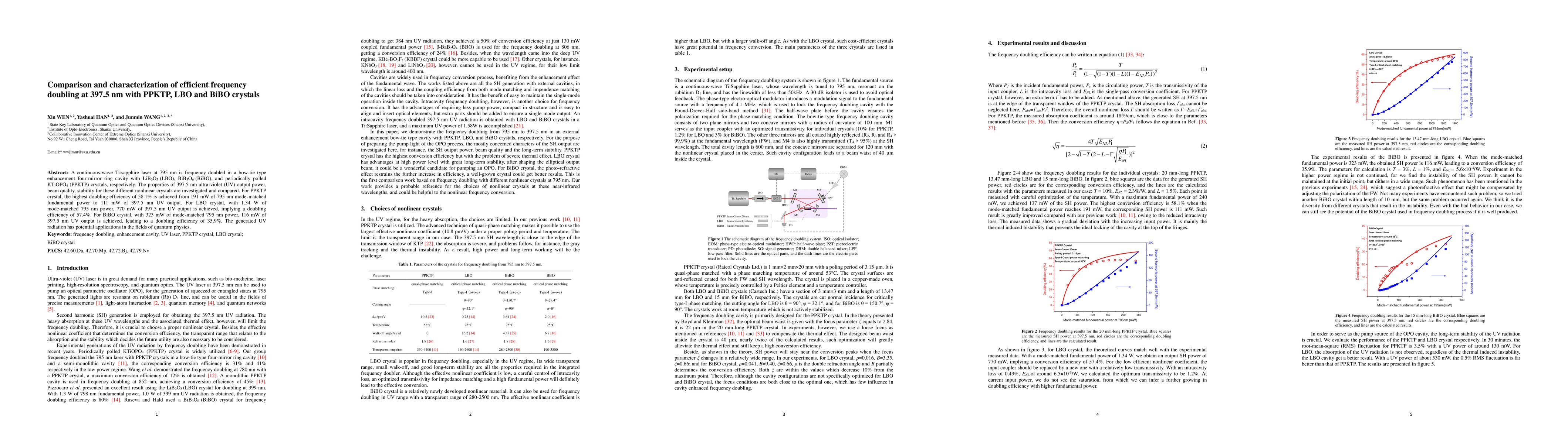 A continuous-wave Ti:sapphire laser at 795 nm is frequency doubled in a bow-tie type enhancement four-mirror ring cavity with LiB3O5 (LBO), BiB3O6 (BiBO), and periodically polled KTiOPO4 (PPKTP) crystals, respectively. The properties of 397.5 nm ultra-violet (UV) output power, beam quality, stability for these different nonlinear crystals are investigated and compared. For PPKTP crystal, the highest doubling efficiency of 58.1% is achieved from 191 mW of 795 nm mode-matched fundamental power to 111 mW of 397.5 nm UV output. For LBO crystal, with 1.34 W of mode-matched 795 nm power, 770 mW of 397.5 nm UV output is achieved, implying a doubling efficiency of 57.4%. For BiBO crystal, with 323 mW of mode-matched 795 nm power, 116 mW of 397.5 nm UV output is achieved, leading to a doubling efficiency of 35.9%. The generated UV radiation has potential applications in the fields of quantum physics