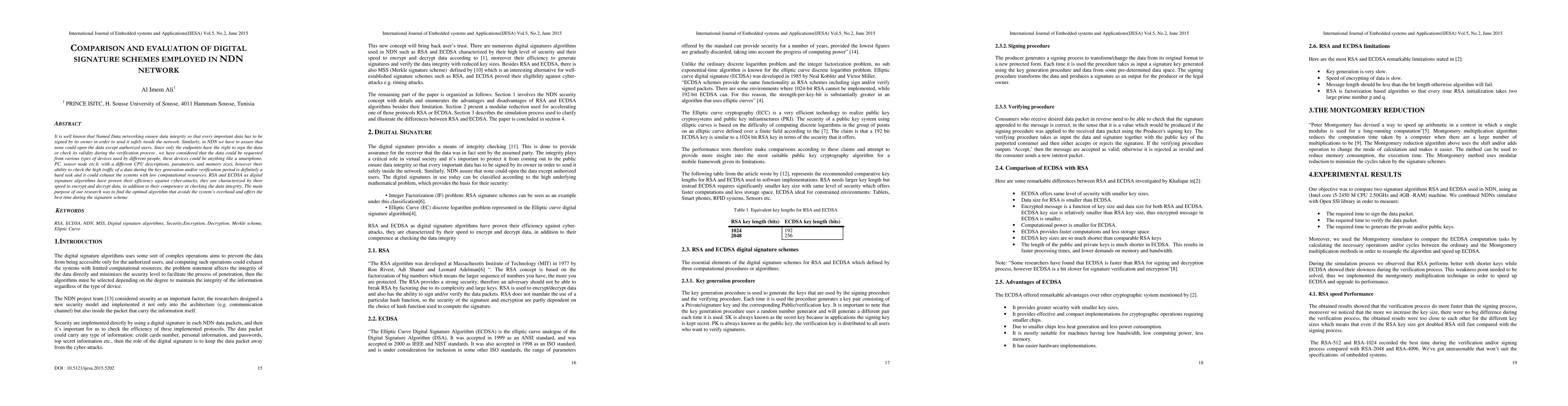 Researchers compared RSA and ECDSA digital signature algorithms in NDN networks to find an efficient algorithm with minimal system overhead. They evaluated the speed and integrity of these algorithms for various devices with different computational resources.