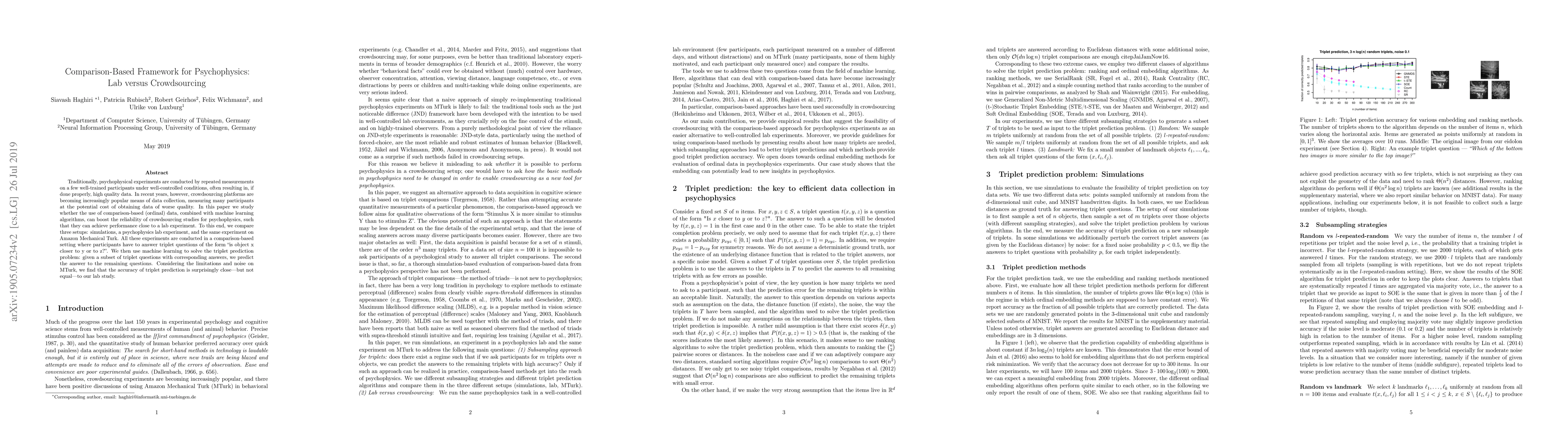 Traditionally, psychophysical experiments are conducted by repeated measurements on a few well-trained participants under well-controlled conditions, often resulting in, if done properly, high quality data. In recent years, however, crowdsourcing platforms are becoming increasingly popular means of data collection, measuring many participants at the potential cost of obtaining data of worse quality. In this paper we study whether the use of comparison-based (ordinal) data, combined with machine learning algorithms, can boost the reliability of crowdsourcing studies for psychophysics, such that they can achieve performance close to a lab experiment. To this end, we compare three setups: simulations, a psychophysics lab experiment, and the same experiment on Amazon Mechanical Turk. All these experiments are conducted in a comparison-based setting where participants have to answer triplet questions of the form "is object x closer to y or to z?". We then use machine learning to solve the triplet prediction problem: given a subset of triplet questions with corresponding answers, we predict the answer to the remaining questions. Considering the limitations and noise on MTurk, we find that the accuracy of triplet prediction is surprisingly close---but not equal---to our lab study.
