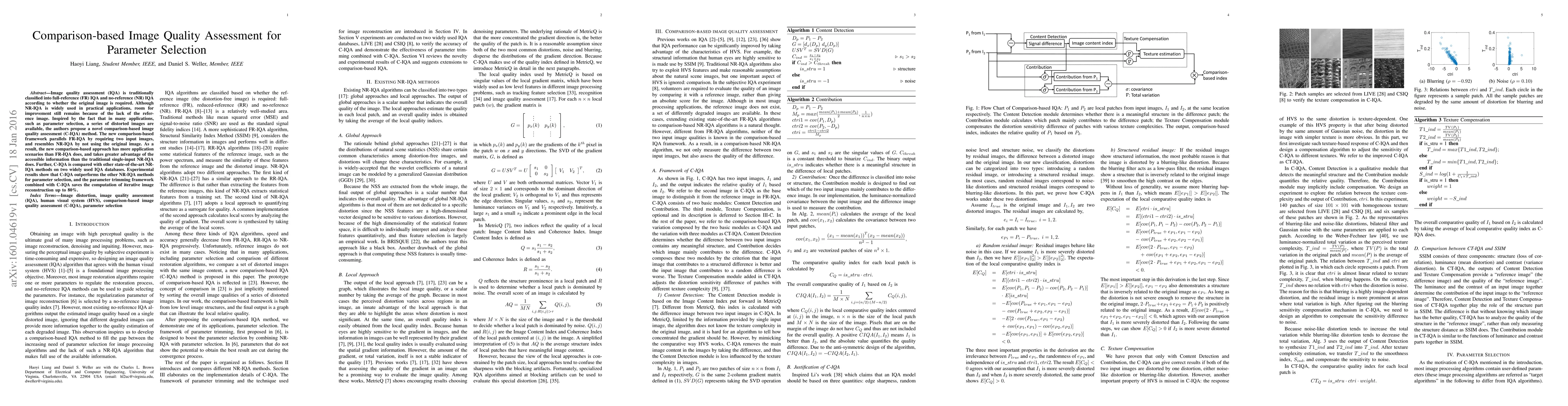 Image quality assessment (IQA) is traditionally classified into full-reference (FR) IQA and no-reference (NR) IQA according to whether the original image is required. Although NR-IQA is widely used in practical applications, room for improvement still remains because of the lack of the reference image. Inspired by the fact that in many applications, such as parameter selection, a series of distorted images are available, the authors propose a novel comparison-based image quality assessment (C-IQA) method. The new comparison-based framework parallels FR-IQA by requiring two input images, and resembles NR-IQA by not using the original image. As a result, the new comparison-based approach has more application scenarios than FR-IQA does, and takes greater advantage of the accessible information than the traditional single-input NR-IQA does. Further, C-IQA is compared with other state-of-the-art NR-IQA methods on two widely used IQA databases. Experimental results show that C-IQA outperforms the other NR-IQA methods for parameter selection, and the parameter trimming framework combined with C-IQA saves the computation of iterative image reconstruction up to 80%.