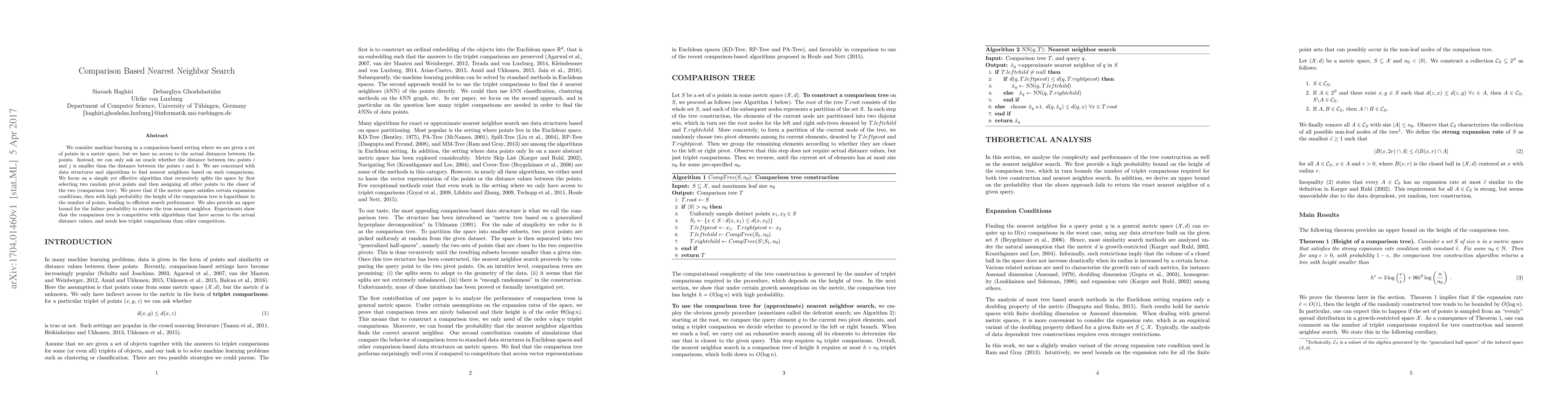 This research introduces a comparison-based nearest neighbor search method for metric spaces without direct distance access. It uses a comparison tree algorithm, proven to have logarithmic height under expansion conditions, and demonstrates competitive performance with fewer triplet comparisons than alternatives through experiments.