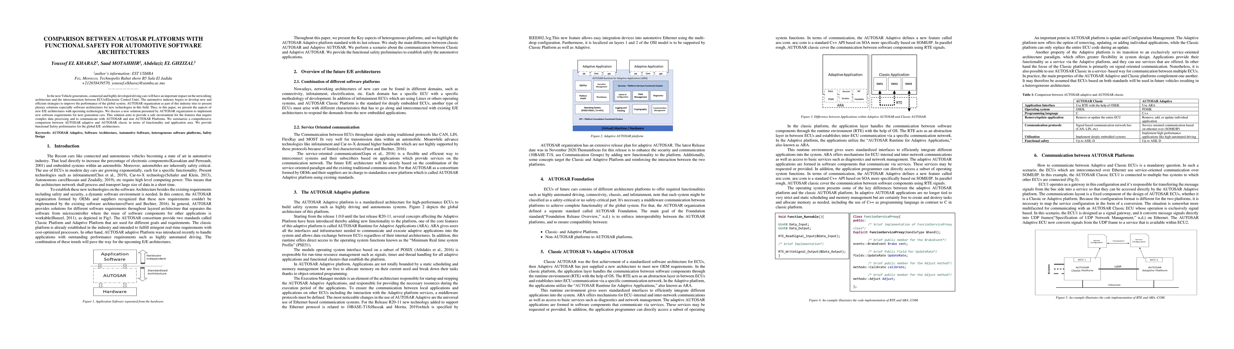 This paper compares AUTOSAR adaptive and AUTOSAR classic platforms, focusing on their functionality and application areas for next-generation automotive software architectures. It discusses AUTOSAR's strategies to enhance system performance and safety, particularly for complex data processing and communication across different platforms.