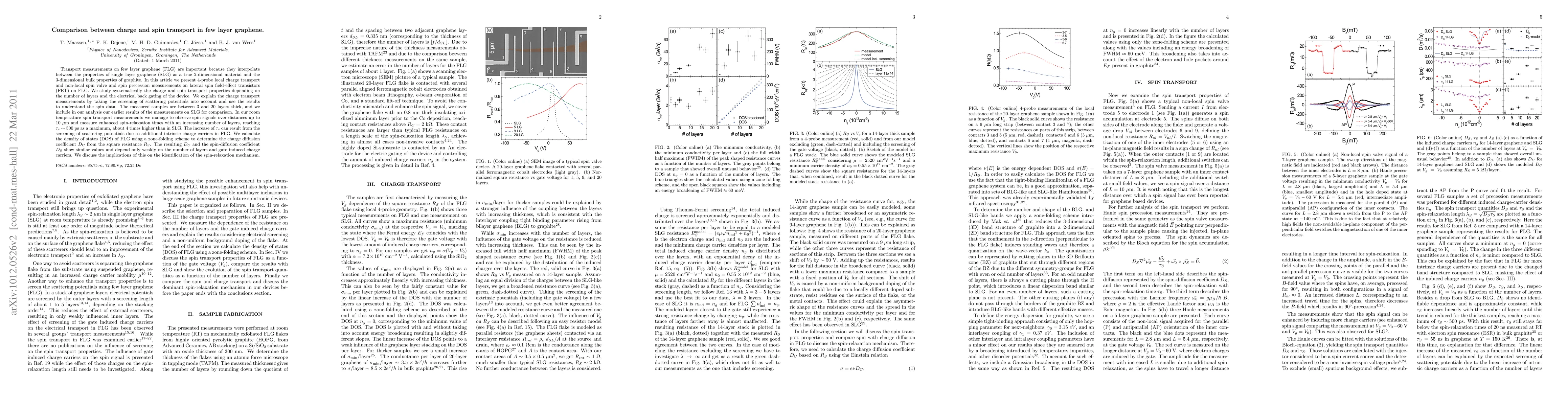 This paper compares charge and spin transport in few layer graphene (FLG) and finds that both charge and spin diffusion coefficients show similar values and weak dependence on the number of layers and gate-induced charge carriers. Spin signals are observed over distances up to 10 µm with relaxation times up to 500 ps, significantly higher than in single layer graphene.