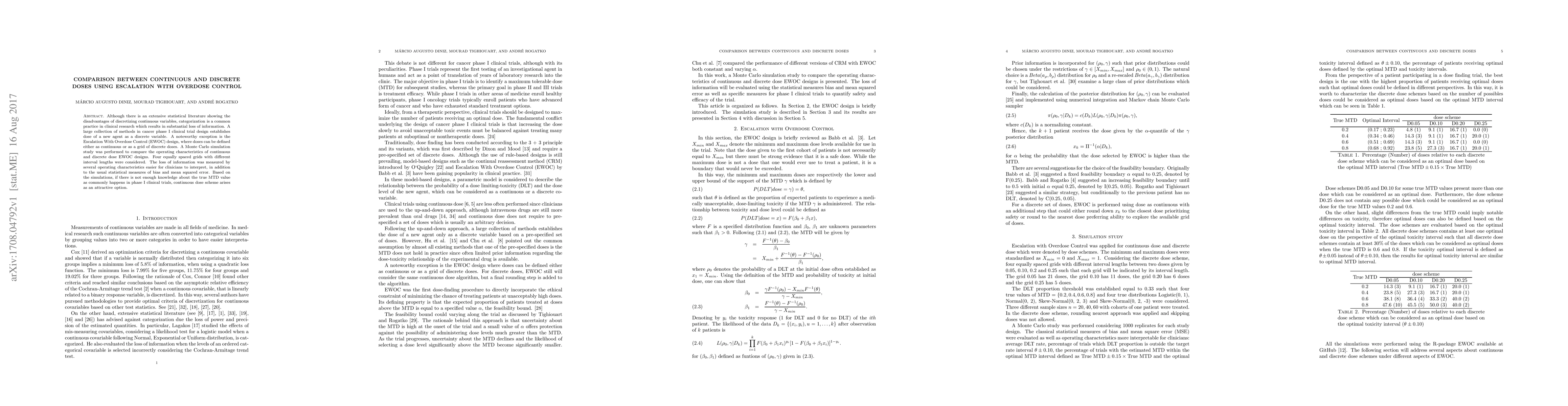 This paper compares continuous and discrete dose schemes in the Escalation With Overdose Control (EWOC) design for phase I clinical trials, finding that continuous dosing may be preferable when the true maximum tolerated dose (MTD) is unknown due to reduced information loss. The study uses Monte Carlo simulations to evaluate various operating characteristics and statistical measures.