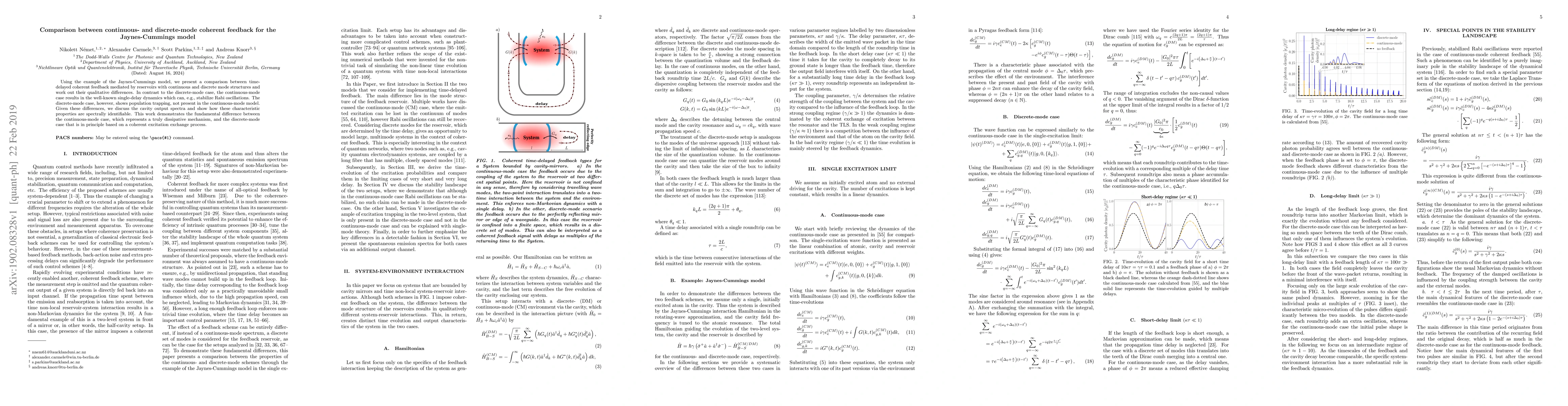 This research compares continuous- and discrete-mode coherent feedback in the Jaynes-Cummings model, revealing distinct dynamics. Continuous-mode feedback stabilizes Rabi oscillations, while discrete-mode feedback leads to population trapping, highlighting their contrasting natures as dissipative and coherent processes respectively.