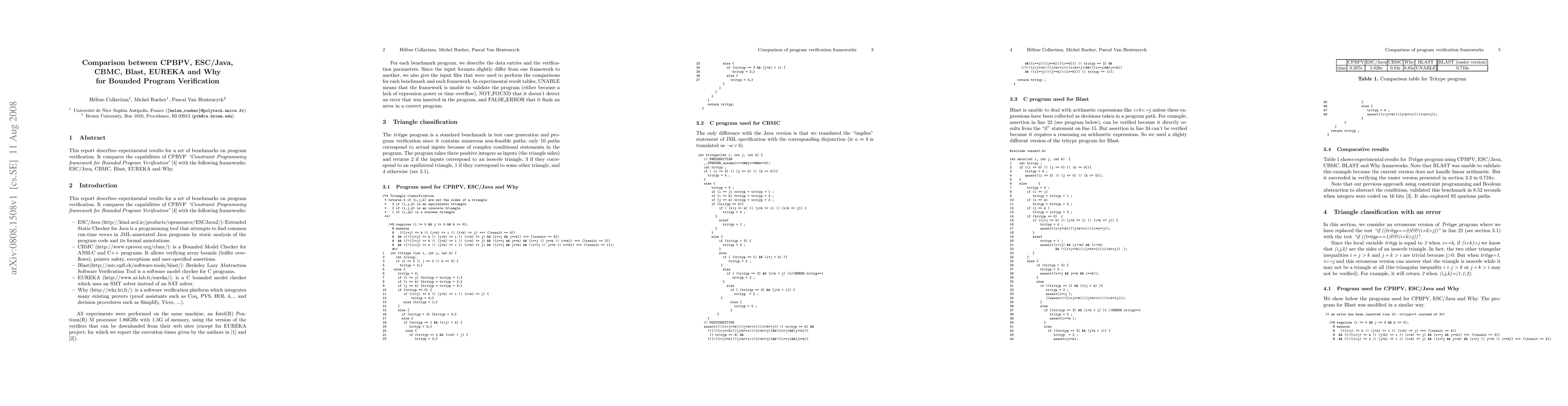 This report describes experimental results for a set of benchmarks on program verification. It compares the capabilities of CPBVP "Constraint Programming framework for Bounded Program Verification" [4] with the following frameworks: ESC/Java, CBMC, Blast, EUREKA and Why.