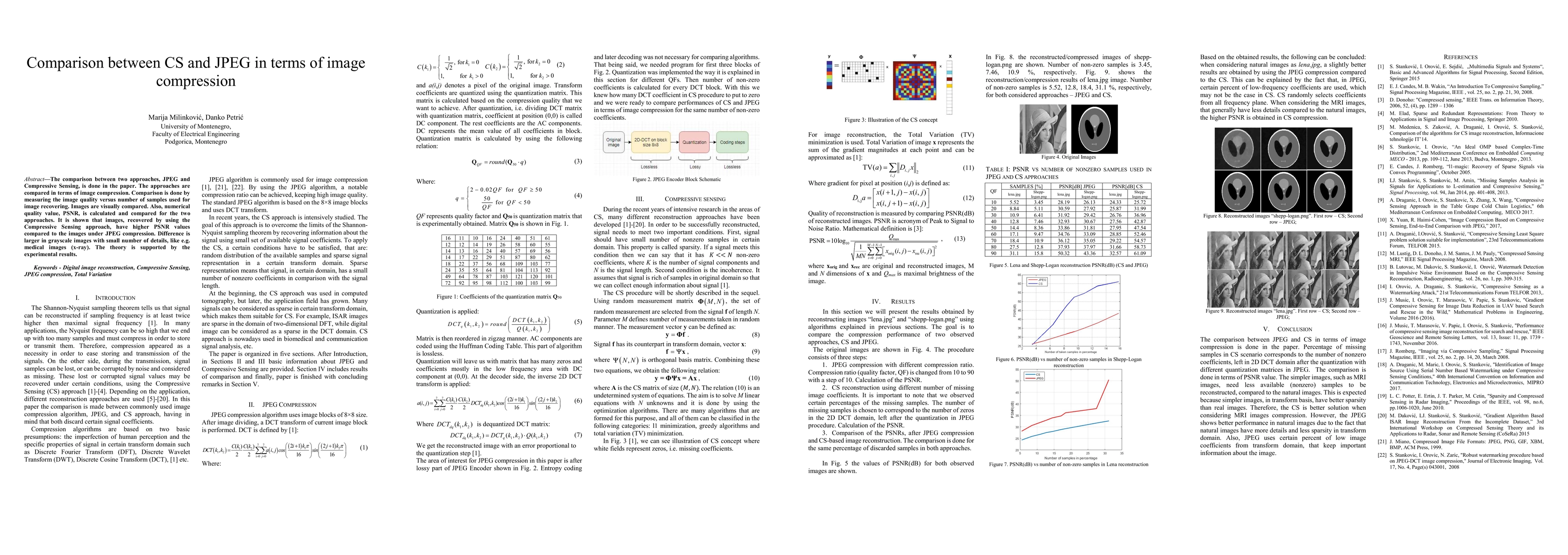 This paper compares JPEG and Compressive Sensing (CS) in terms of image compression, finding that CS yields higher PSNR values and better visual quality, especially in grayscale medical images with fewer details. Experimental results support the theoretical advantages of CS over JPEG.