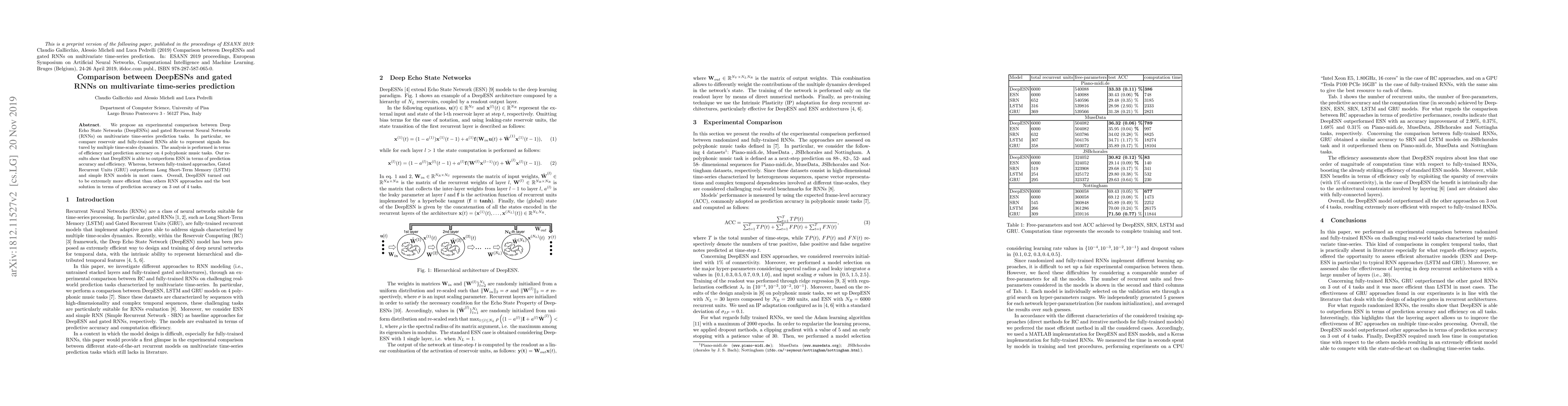 This paper compares Deep Echo State Networks (DeepESNs) and gated RNNs for multivariate time-series prediction, finding DeepESNs outperform Echo State Networks in accuracy and efficiency. Gated Recurrent Units (GRU) generally outperform Long Short-Term Memory (LSTM) and simple RNNs, with DeepESNs being the most efficient and accurate on 3 out of 4 music tasks.