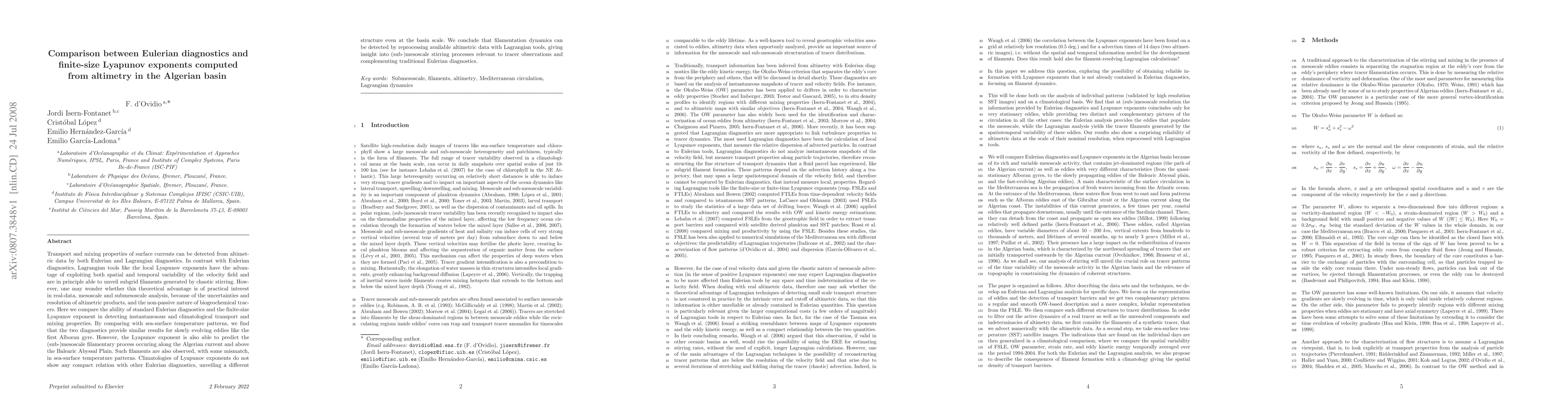 This paper compares Eulerian diagnostics and finite-size Lyapunov exponents derived from altimetry data in the Algerian basin to detect transport and mixing properties. While both methods show similar results for slowly evolving eddies, the Lyapunov exponent additionally reveals submesoscale filamentary processes, highlighting its potential for analyzing chaotic stirring and complementing traditional Eulerian diagnostics.