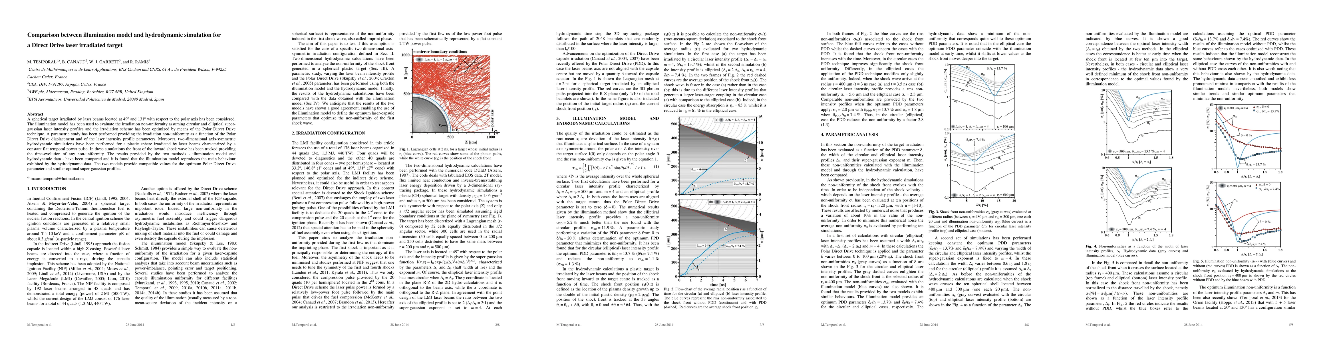 This paper compares illumination model predictions with hydrodynamic simulations for a laser-irradiated spherical target. The illumination model optimizes non-uniformity using the Polar Direct Drive technique, while hydrodynamic simulations track shock wave fronts. Both methods yield comparable results, validating the illumination model's accuracy.
