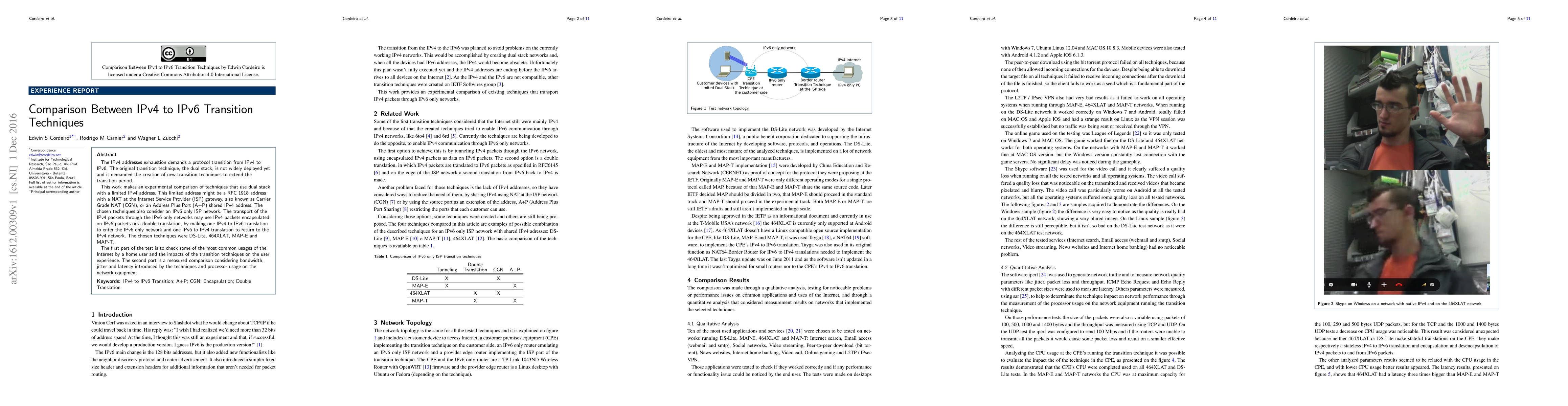 This paper compares various IPv4 to IPv6 transition techniques, focusing on DS-Lite, 464XLAT, MAP-E, and MAP-T. It evaluates their impact on user experience and measures performance factors like bandwidth, jitter, latency, and processor usage on network equipment.