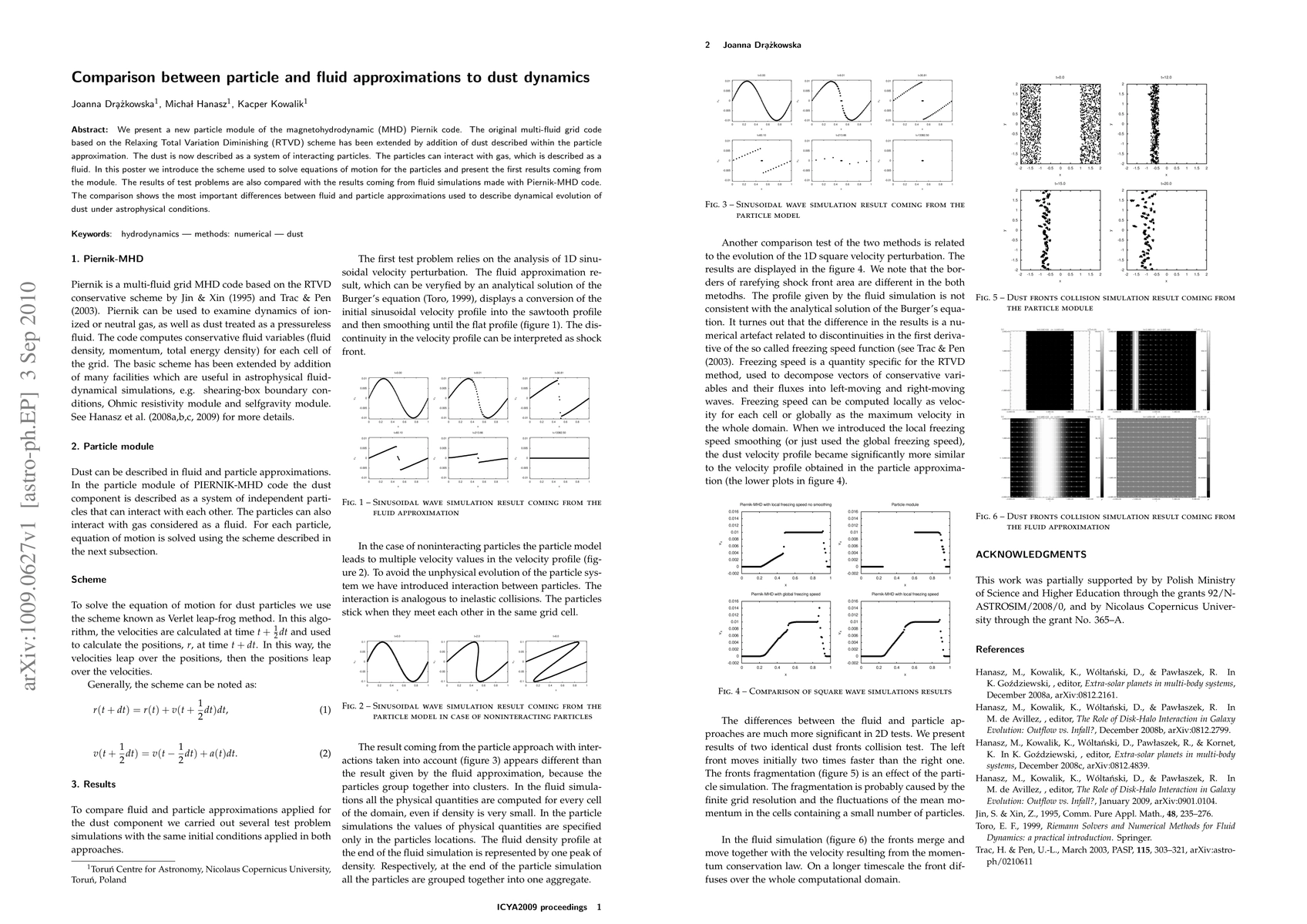 This paper introduces a new particle module in the MHD Piernik code, extending its multi-fluid grid capabilities to include dust described as interacting particles. The study compares the results of particle simulations with fluid simulations to highlight the differences in dust dynamics under astrophysical conditions.