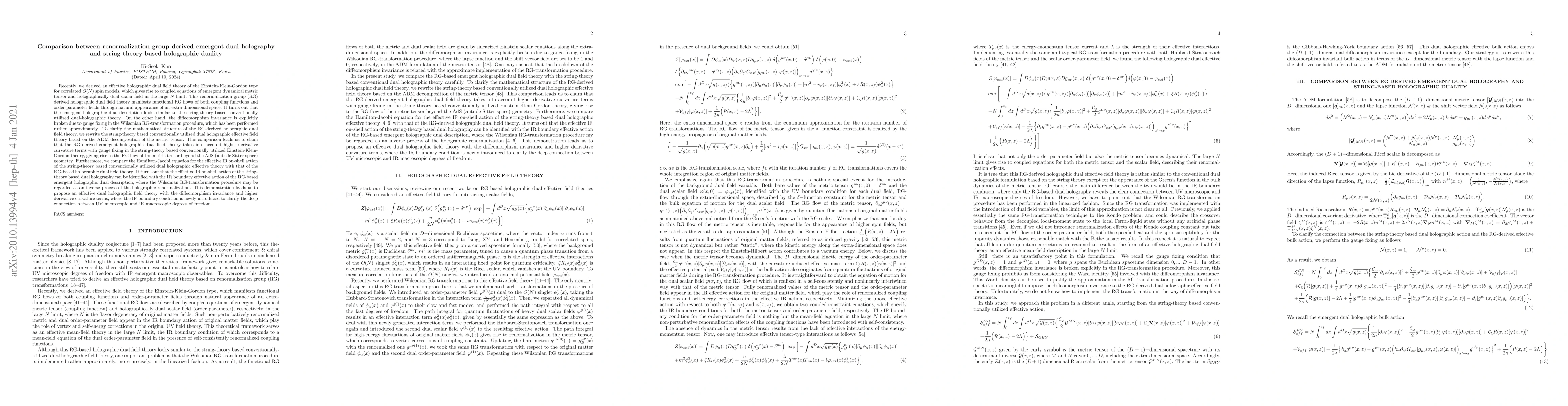 This paper compares renormalization group (RG) derived emergent dual holography with string theory based holographic duality, showing that the former incorporates higher-derivative curvature terms and gauge fixing, leading to an RG flow of the metric tensor beyond AdS geometry. It also establishes a connection between the IR boundary effective action of RG-based holography and the effective IR on-shell action of string theory-based holography, proposing a new dual holographic field theory with diffeomorphism invariance and higher derivative curvature terms.