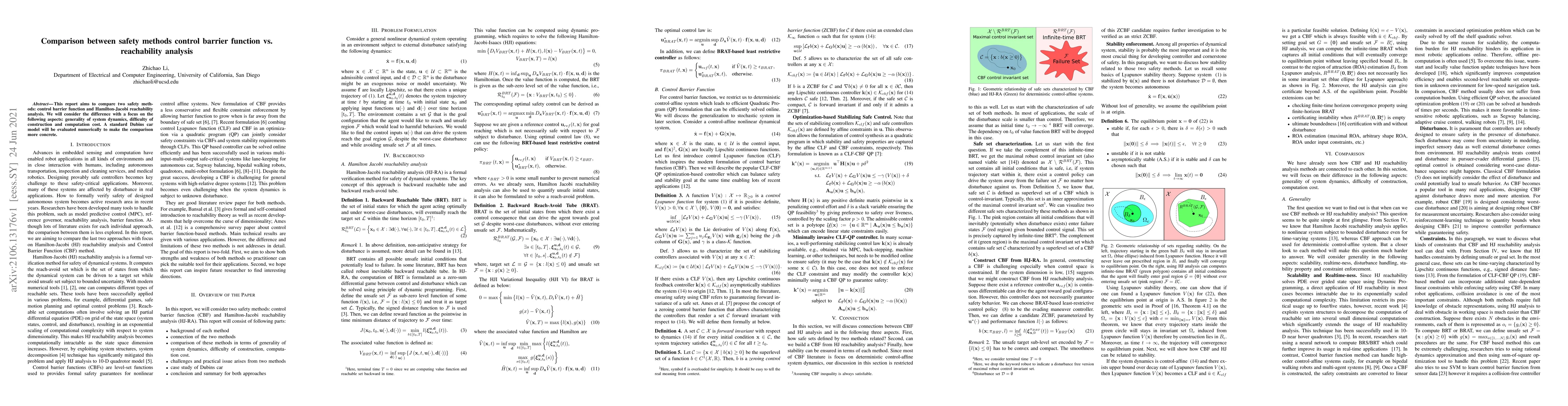 This report aims to compare two safety methods: control barrier function and Hamilton-Jacobi reachability analysis. We will consider the difference with a focus on the following aspects: generality of system dynamics, difficulty of construction and computation cost. A standard Dubins car model will be evaluated numerically to make the comparison more concrete.