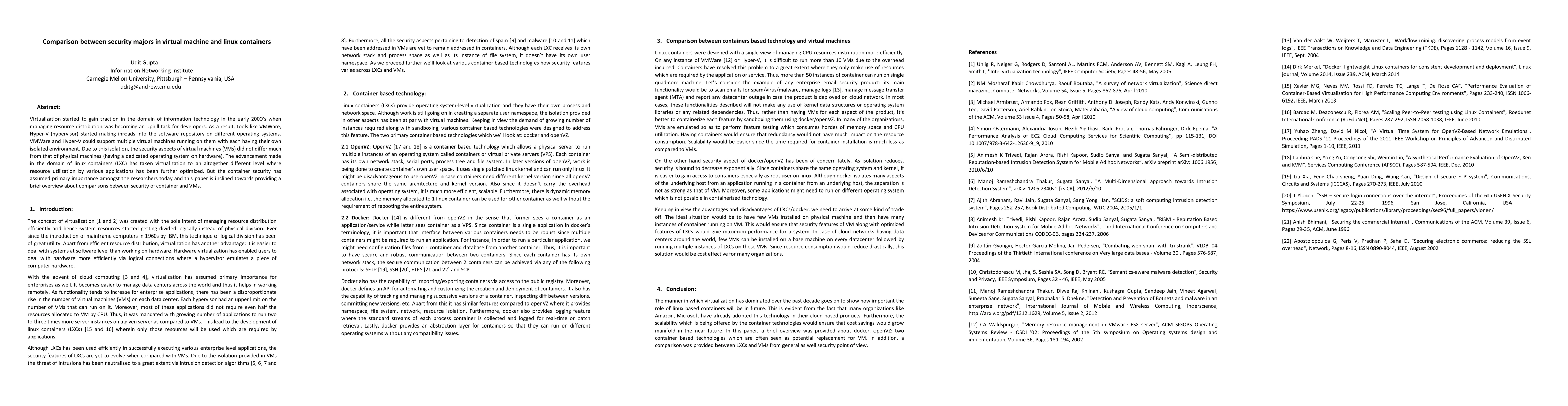 This paper compares the security aspects of virtual machines (VMs) and Linux containers (LXC), highlighting how VMs offer isolation similar to physical machines, while container security has become a critical focus due to the optimized resource utilization in containerized environments.