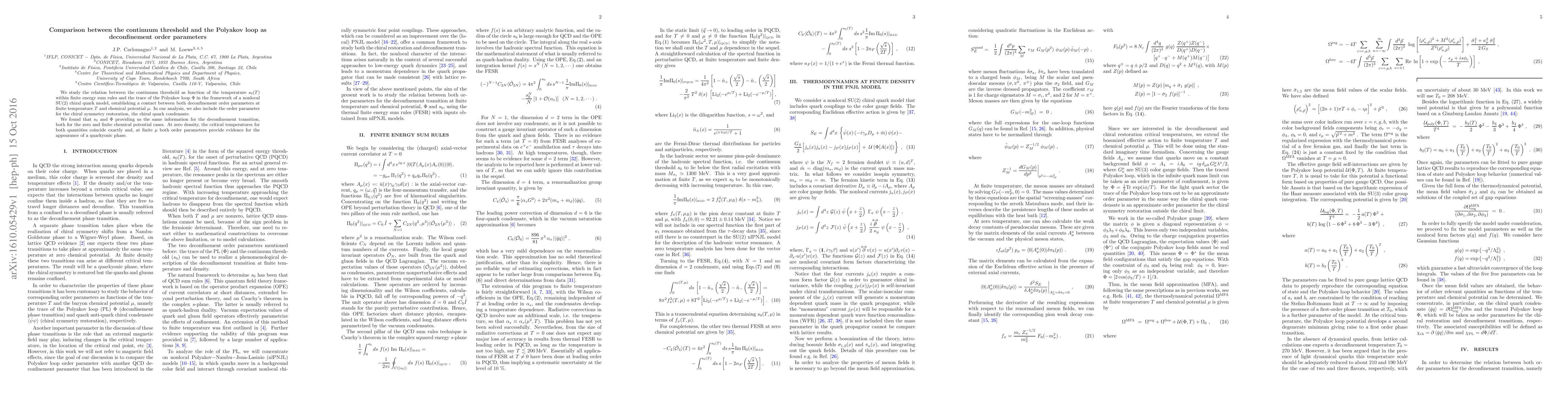 We study the relation between the continuum threshold as function of the temperature $s_0(T)$ within finite energy sum rules and the trace of the Polyakov loop $\Phi$ in the framework of a nonlocal SU(2) chiral quark model, establishing a contact between both deconfinement order parameters at finite temperature $T$ and chemical potential $\mu$. In our analysis, we also include the order parameter for the chiral symmetry restoration, the chiral quark condensate. We found that $s_0$ and $\Phi$ providing us the same information for the deconfinement transition, both for the zero and finite chemical potential cases. At zero density, the critical temperatures for both quantities coincide exactly and, at finite $\mu$ both order parameters provide evidence for the appearance of a quarkyonic phase.