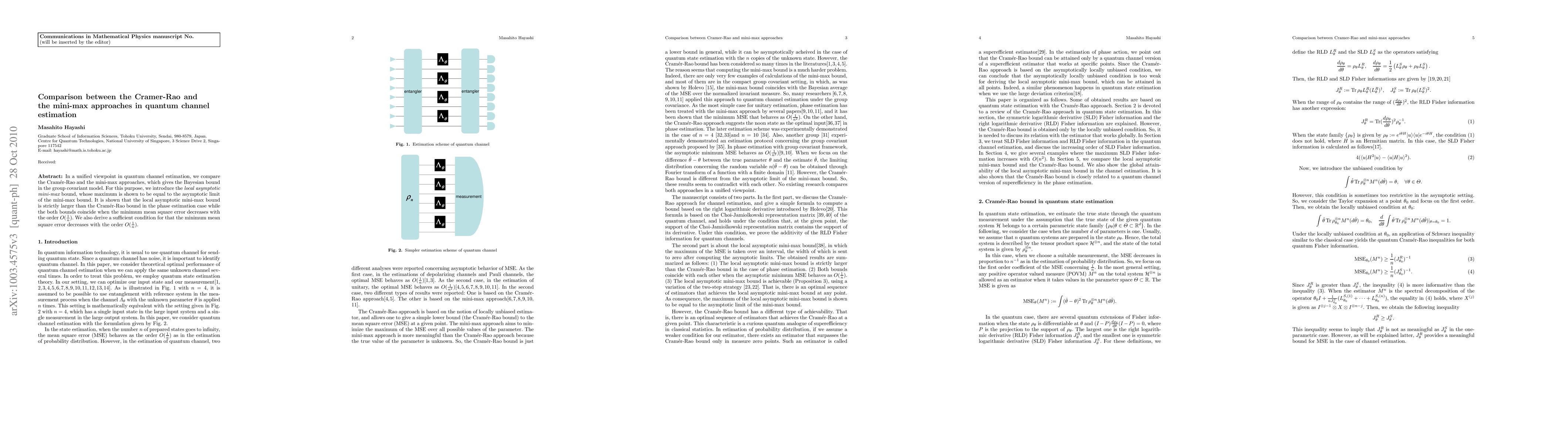 This paper compares the Cramer-Rao and mini-max approaches in quantum channel estimation, showing that the local asymptotic mini-max bound is superior to the Cramer-Rao bound in phase estimation scenarios. It also establishes conditions under which both bounds coincide as the minimum mean square error decreases with O(1/n).