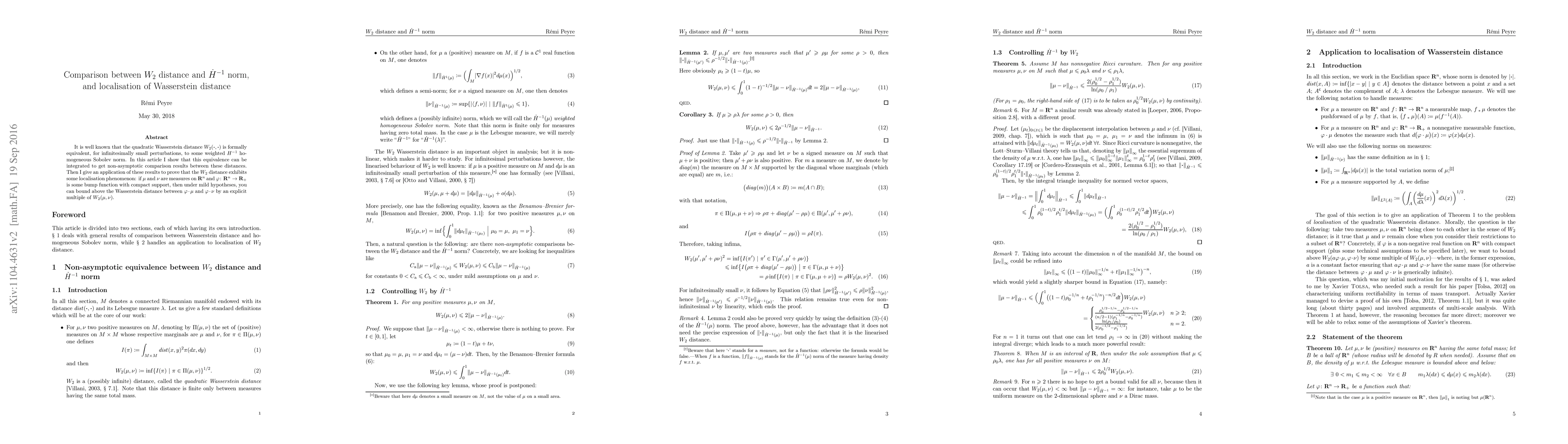This paper compares the quadratic Wasserstein distance with a $H^{-1}$ norm, showing that they can be integrated for non-asymptotic comparison results. It also proves the localisation phenomenon of the Wasserstein distance by bounding its value above an explicit multiple of the $W_2$ distance between two measures.
