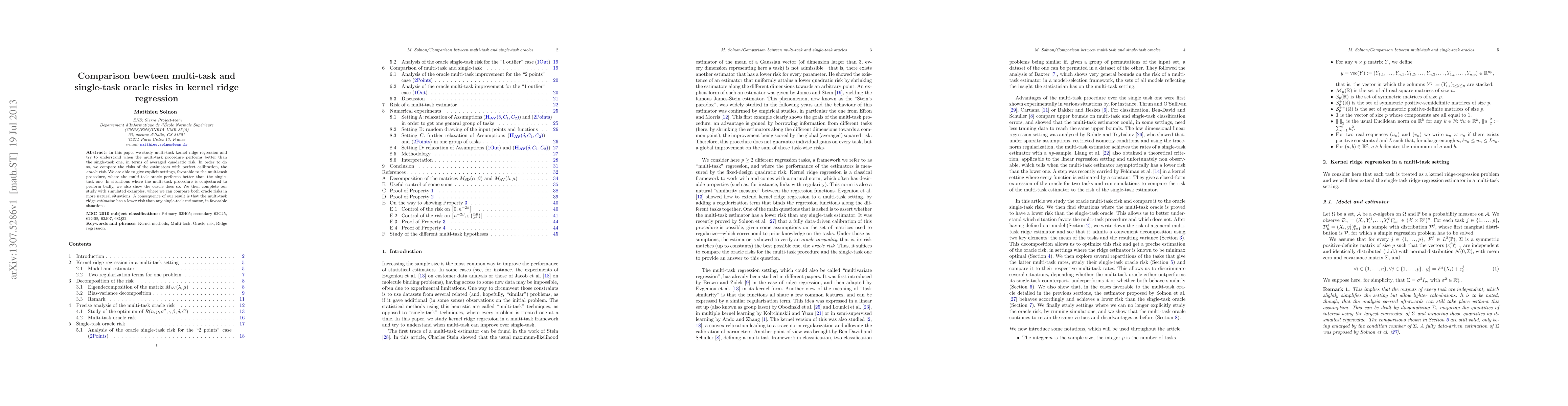 A study compares multi-task and single-task kernel ridge regression, finding that in favorable situations, the multi-task approach can lead to lower risk than individual single-task estimators.