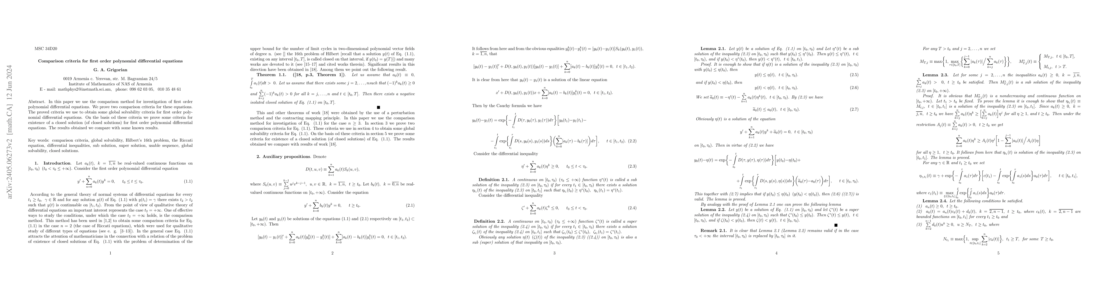 This paper establishes two new comparison criteria for first order polynomial differential equations and utilizes them to derive global solvability and conditions for the existence of closed solutions. The findings are compared with existing results to validate their novelty and efficacy.