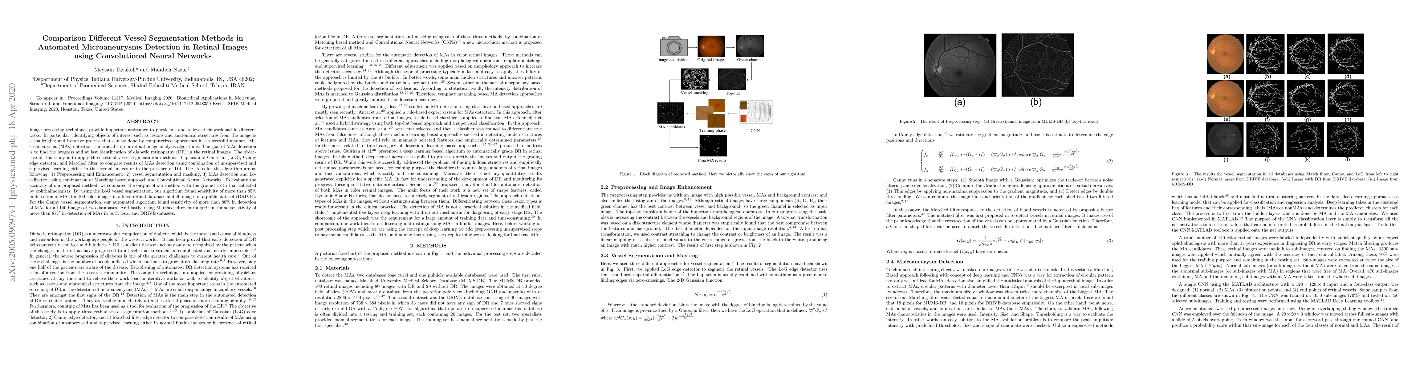 This study compares three vessel segmentation methods—Laplacian-of-Gaussian, Canny edge detector, and Matched filter—for automated microaneurysm detection in retinal images using convolutional neural networks. Results show high sensitivity, exceeding 85% for Laplacian-of-Gaussian, over 80% for Canny, and more than 87% for Matched filter, indicating their effectiveness in diabetic retinopathy identification.