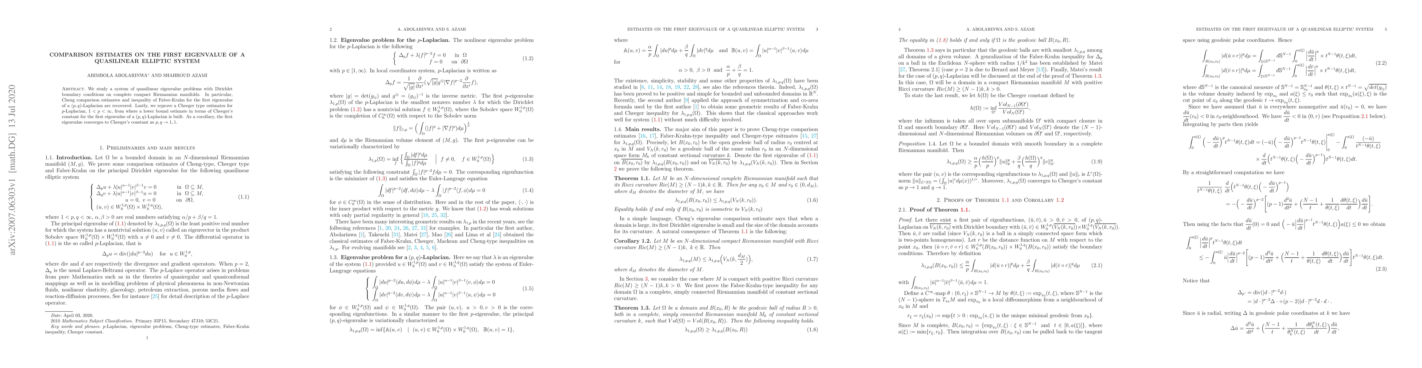 This paper investigates quasilinear elliptic eigenvalue problems on complete compact Riemannian manifolds, deriving Cheng comparison estimates and Faber-Krahn inequalities for the first eigenvalue of $(p,q)$-Laplacian systems. It also establishes Cheeger type estimates for $p$-Laplacian and provides a lower bound for the first eigenvalue in terms of Cheeger's constant.