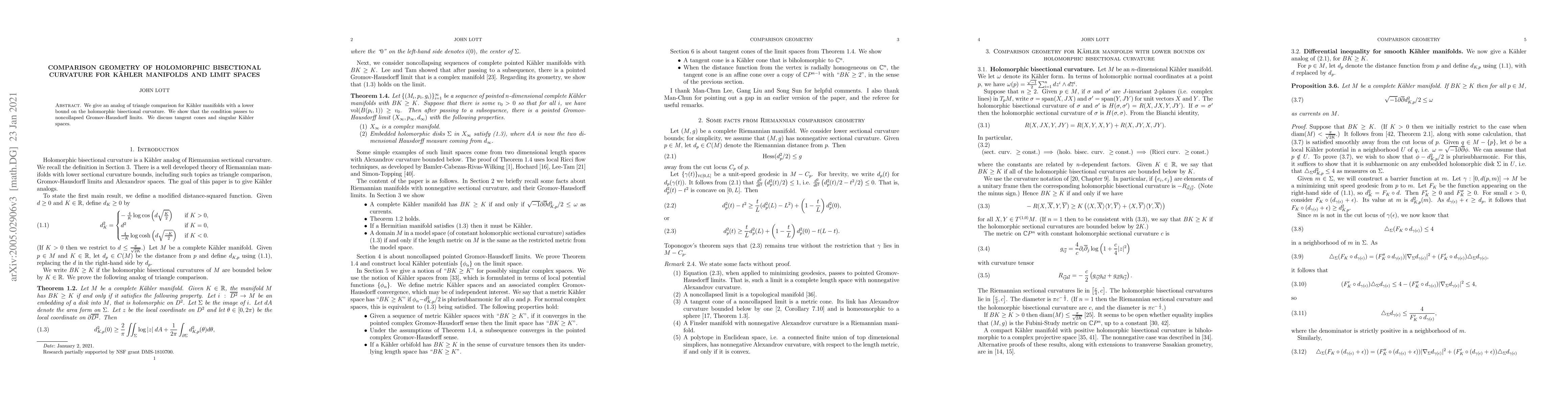 We give an analog of triangle comparison for Kaehler manifolds with a lower bound on the holomorphic bisectional curvature. We show that the condition passes to noncollapsed Gromov-Hausdorff limits. We discuss tangent cones and singular Kaehler spaces.