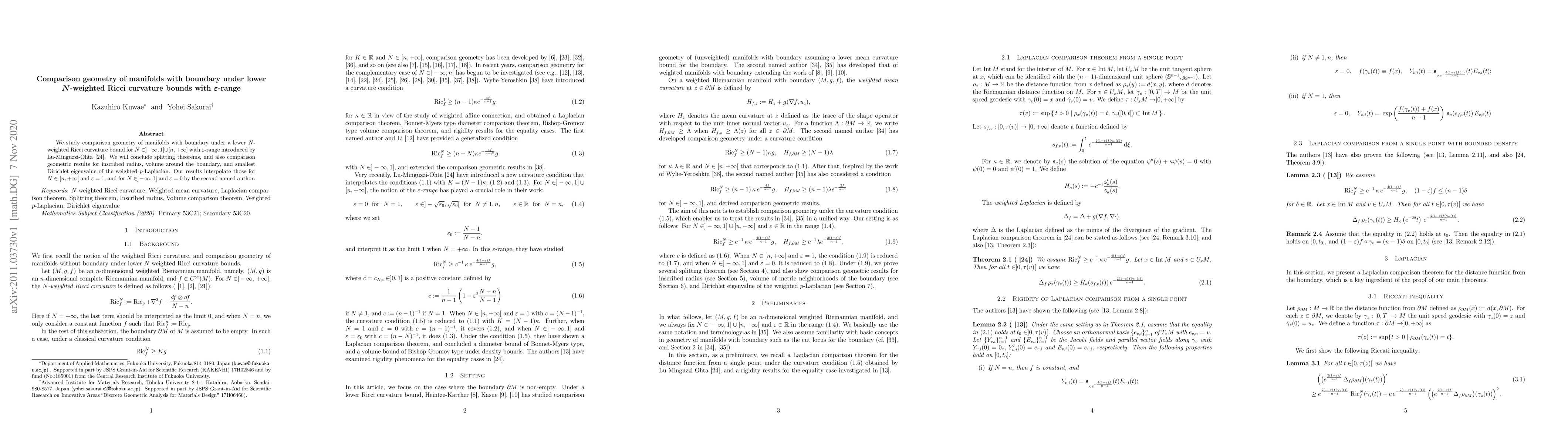 This paper investigates the comparison geometry of manifolds with boundary under lower $N$-weighted Ricci curvature bounds, focusing on $\varepsilon$-range conditions. It establishes splitting theorems and comparison geometric results for inscribed radius, boundary volume, and the smallest Dirichlet eigenvalue of the weighted $p$-Laplacian.