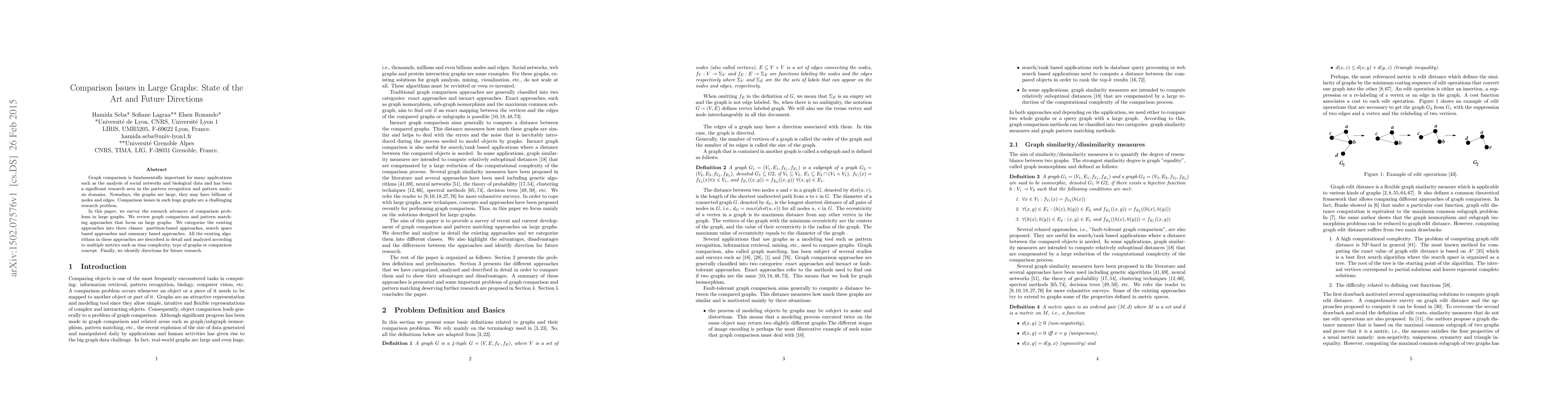 This paper surveys advances in graph comparison for large graphs, categorizing existing approaches into partition-based, search space based, and summary based methods. It analyzes these algorithms in terms of time complexity and other metrics, and identifies future research directions.