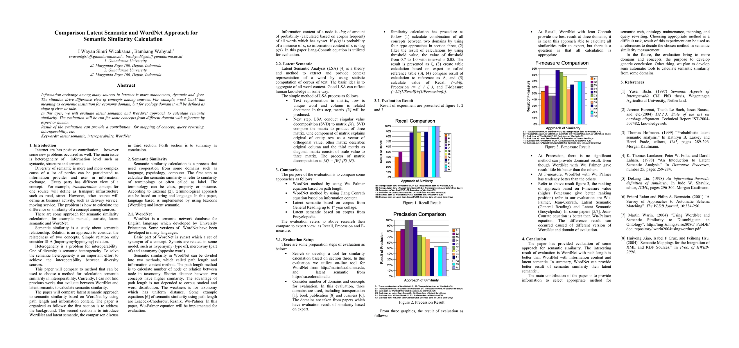 Information exchange among many sources in Internet is more autonomous, dynamic and free. The situation drive difference view of concepts among sources. For example, word 'bank' has meaning as economic institution for economy domain, but for ecology domain it will be defined as slope of river or lake. In this aper, we will evaluate latent semantic and WordNet approach to calculate semantic similarity. The evaluation will be run for some concepts from different domain with reference by expert or human. Result of the evaluation can provide a contribution for mapping of concept, query rewriting, interoperability, etc.