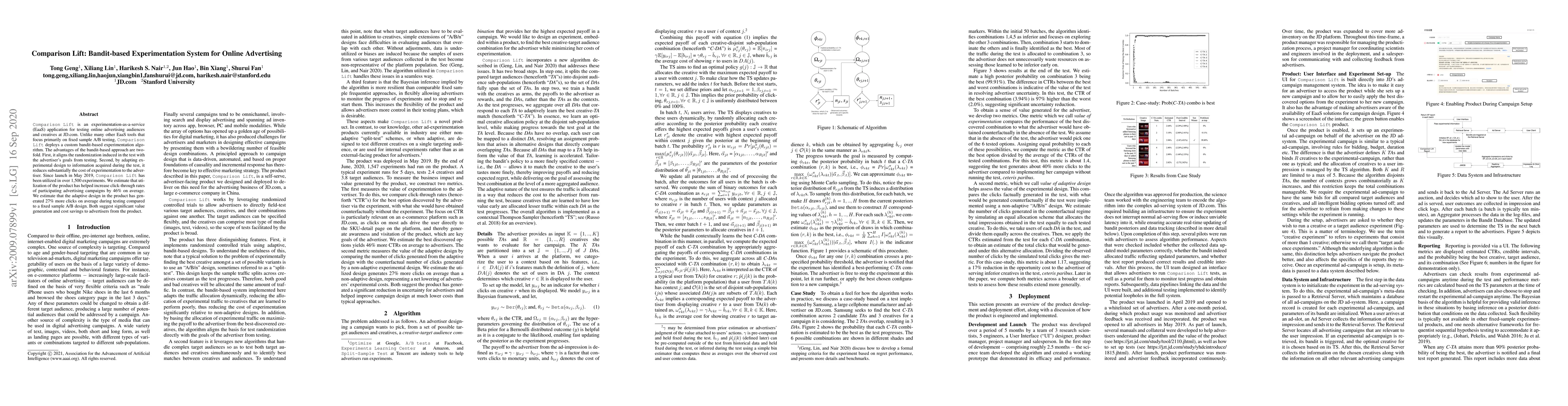 Comparison Lift is an experimentation-as-a-service (EaaS) application for testing online advertising audiences and creatives at JD.com. Unlike many other EaaS tools that focus primarily on fixed sample A/B testing, Comparison Lift deploys a custom bandit-based experimentation algorithm. The advantages of the bandit-based approach are two-fold. First, it aligns the randomization induced in the test with the advertiser's goals from testing. Second, by adapting experimental design to information acquired during the test, it reduces substantially the cost of experimentation to the advertiser. Since launch in May 2019, Comparison Lift has been utilized in over 1,500 experiments. We estimate that utilization of the product has helped increase click-through rates of participating advertising campaigns by 46% on average. We estimate that the adaptive design in the product has generated 27% more clicks on average during testing compared to a fixed sample A/B design. Both suggest significant value generation and cost savings to advertisers from the product.